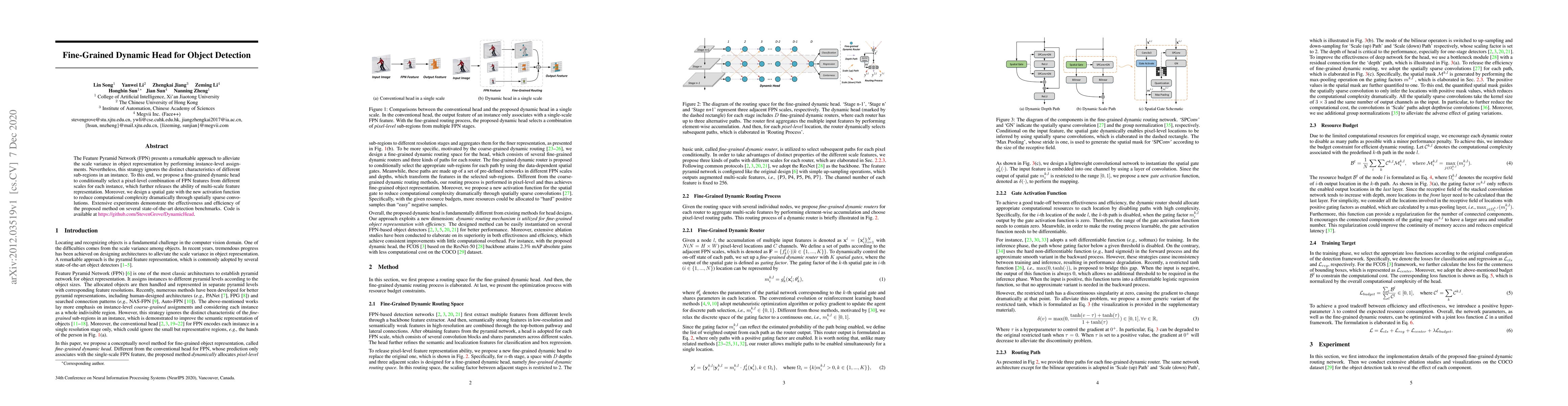 This paper proposes a fine-grained dynamic head for object detection that enhances the Feature Pyramid Network by conditionally selecting multi-scale FPN features for each instance, improving scale variance handling. It also introduces a spatial gate with a new activation function to significantly reduce computational complexity.
