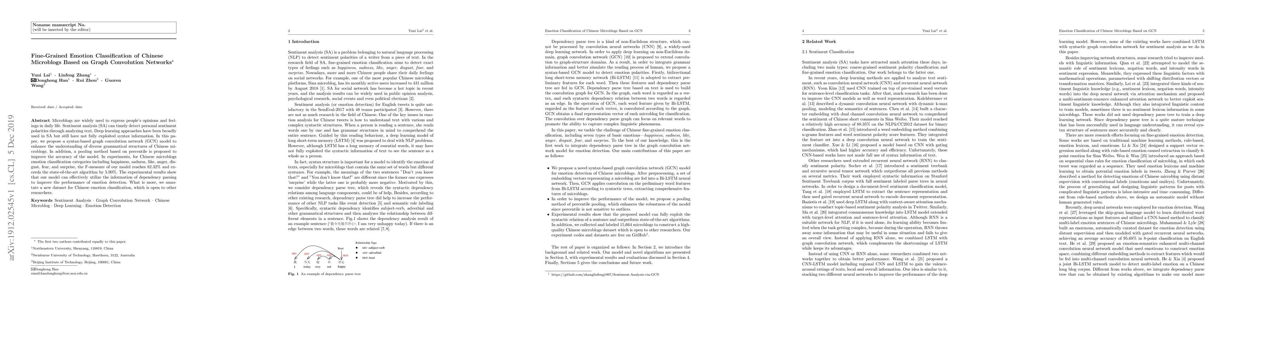 Microblogs are widely used to express people's opinions and feelings in daily life. Sentiment analysis (SA) can timely detect personal sentiment polarities through analyzing text. Deep learning approaches have been broadly used in SA but still have not fully exploited syntax information. In this paper, we propose a syntax-based graph convolution network (GCN) model to enhance the understanding of diverse grammatical structures of Chinese microblogs. In addition, a pooling method based on percentile is proposed to improve the accuracy of the model. In experiments, for Chinese microblogs emotion classification categories including happiness, sadness, like, anger, disgust, fear, and surprise, the F-measure of our model reaches 82.32% and exceeds the state-of-the-art algorithm by 5.90%. The experimental results show that our model can effectively utilize the information of dependency parsing to improve the performance of emotion detection. What is more, we annotate a new dataset for Chinese emotion classification, which is open to other researchers.