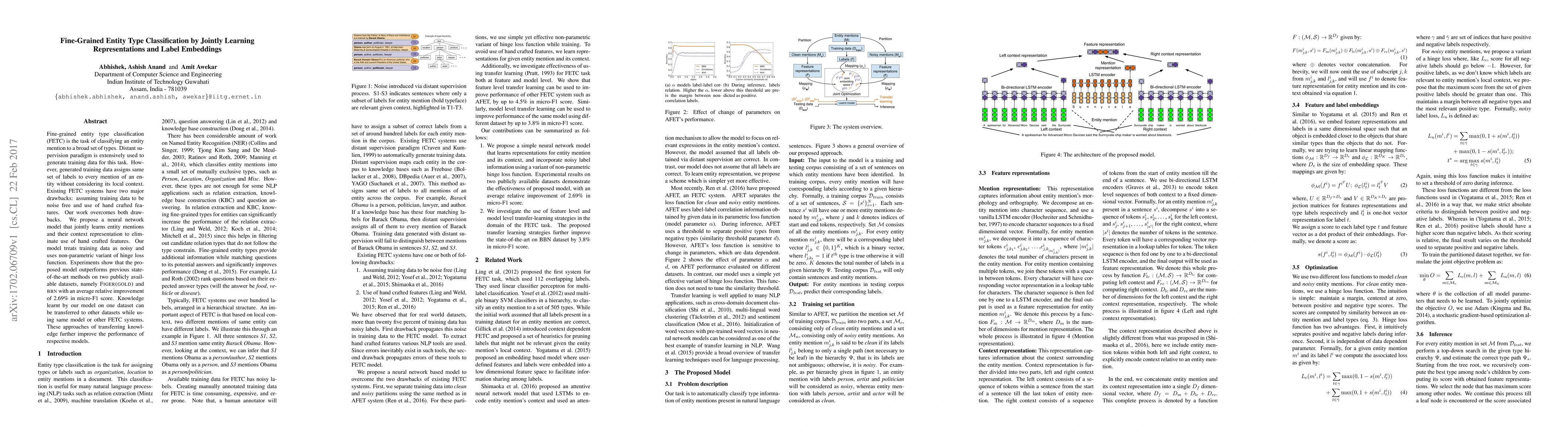 Fine-grained entity type classification (FETC) is the task of classifying an entity mention to a broad set of types. Distant supervision paradigm is extensively used to generate training data for this task. However, generated training data assigns same set of labels to every mention of an entity without considering its local context. Existing FETC systems have two major drawbacks: assuming training data to be noise free and use of hand crafted features. Our work overcomes both drawbacks. We propose a neural network model that jointly learns entity mentions and their context representation to eliminate use of hand crafted features. Our model treats training data as noisy and uses non-parametric variant of hinge loss function. Experiments show that the proposed model outperforms previous state-of-the-art methods on two publicly available datasets, namely FIGER (GOLD) and BBN with an average relative improvement of 2.69% in micro-F1 score. Knowledge learnt by our model on one dataset can be transferred to other datasets while using same model or other FETC systems. These approaches of transferring knowledge further improve the performance of respective models.
