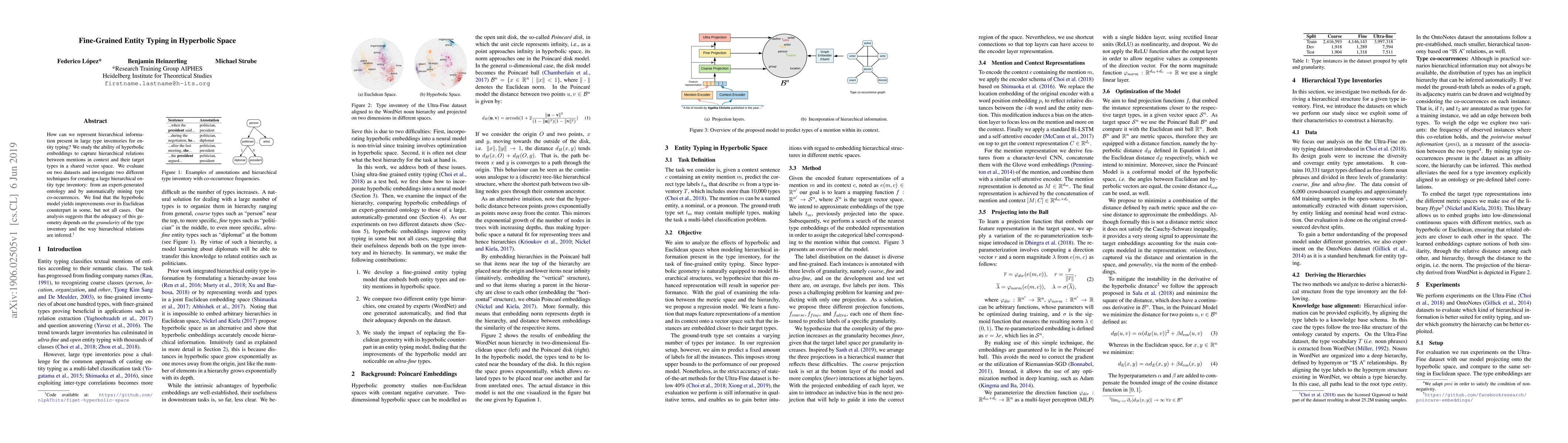 How can we represent hierarchical information present in large type inventories for entity typing? We study the ability of hyperbolic embeddings to capture hierarchical relations between mentions in context and their target types in a shared vector space. We evaluate on two datasets and investigate two different techniques for creating a large hierarchical entity type inventory: from an expert-generated ontology and by automatically mining type co-occurrences. We find that the hyperbolic model yields improvements over its Euclidean counterpart in some, but not all cases. Our analysis suggests that the adequacy of this geometry depends on the granularity of the type inventory and the way hierarchical relations are inferred.