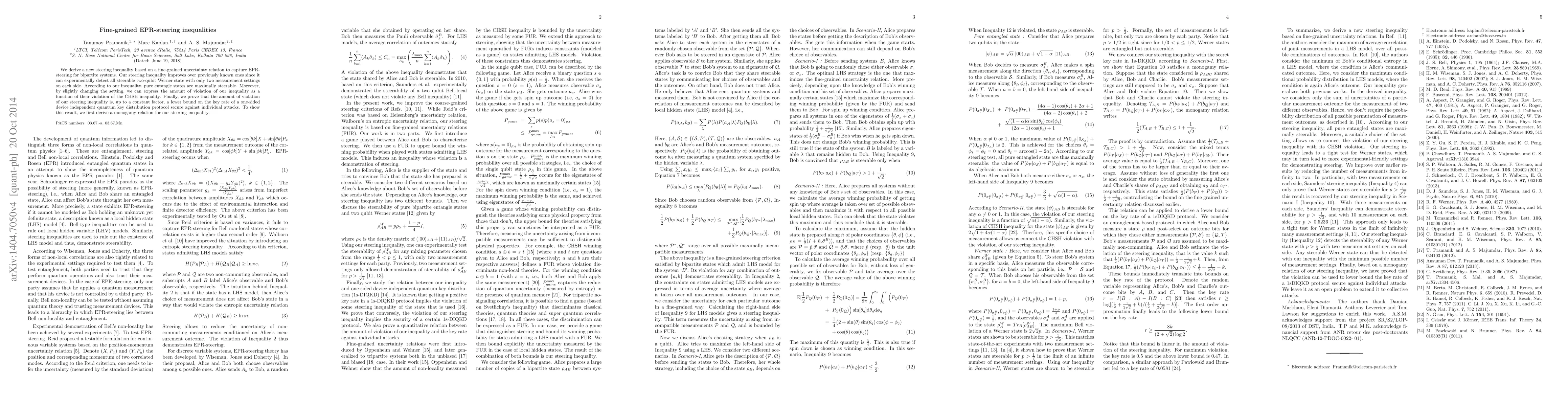 We derive a new steering inequality based on a fine-grained uncertainty relation to capture EPR-steering for bipartite systems. Our steering inequality improves over previously known ones since it can experimentally detect all steerable two-qubit Werner state with only two measurement settings on each side. According to our inequality, pure entangle states are maximally steerable. Moreover, by slightly changing the setting, we can express the amount of violation of our inequality as a function of their violation of the CHSH inequality. Finally, we prove that the amount of violation of our steering inequality is, up to a constant factor, a lower bound on the key rate of a one-sided device independent quantum key distribution protocol secure against individual attacks. To show this result, we first derive a monogamy relation for our steering inequality.