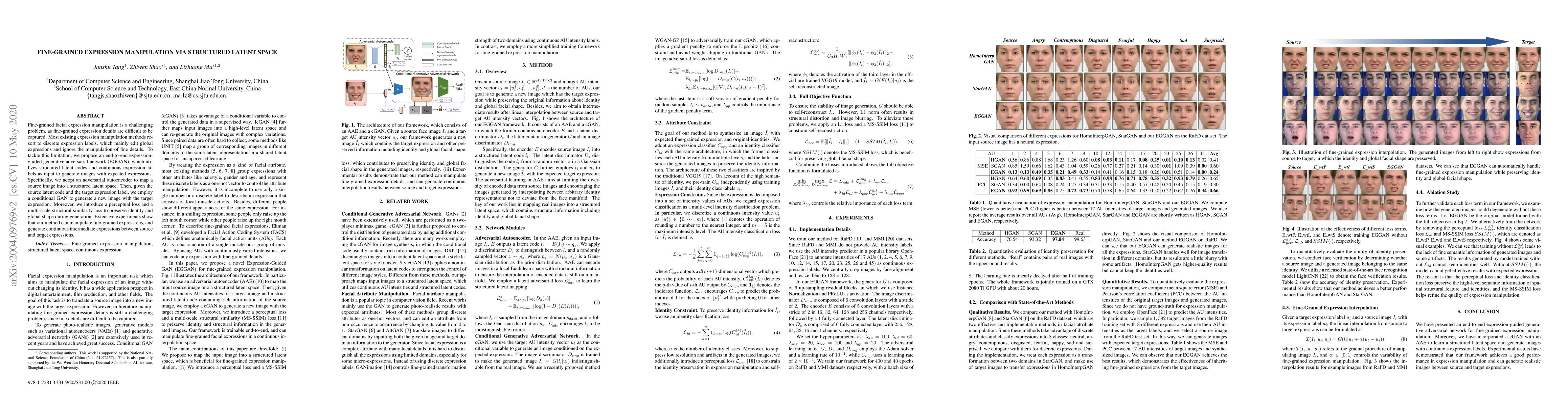 This paper proposes an end-to-end EGGAN for fine-grained facial expression manipulation using structured latent codes and continuous expression labels. The method employs an adversarial autoencoder and conditional GAN to generate images with precise expression details while preserving identity and global structure.