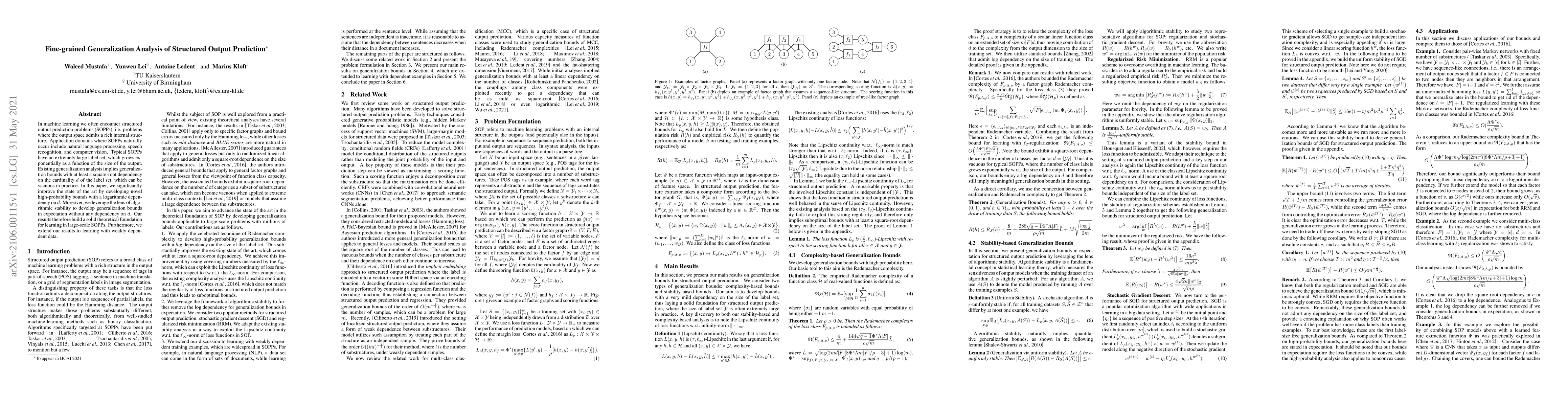 In machine learning we often encounter structured output prediction problems (SOPPs), i.e. problems where the output space admits a rich internal structure. Application domains where SOPPs naturally occur include natural language processing, speech recognition, and computer vision. Typical SOPPs have an extremely large label set, which grows exponentially as a function of the size of the output. Existing generalization analysis implies generalization bounds with at least a square-root dependency on the cardinality $d$ of the label set, which can be vacuous in practice. In this paper, we significantly improve the state of the art by developing novel high-probability bounds with a logarithmic dependency on $d$. Moreover, we leverage the lens of algorithmic stability to develop generalization bounds in expectation without any dependency on $d$. Our results therefore build a solid theoretical foundation for learning in large-scale SOPPs. Furthermore, we extend our results to learning with weakly dependent data.