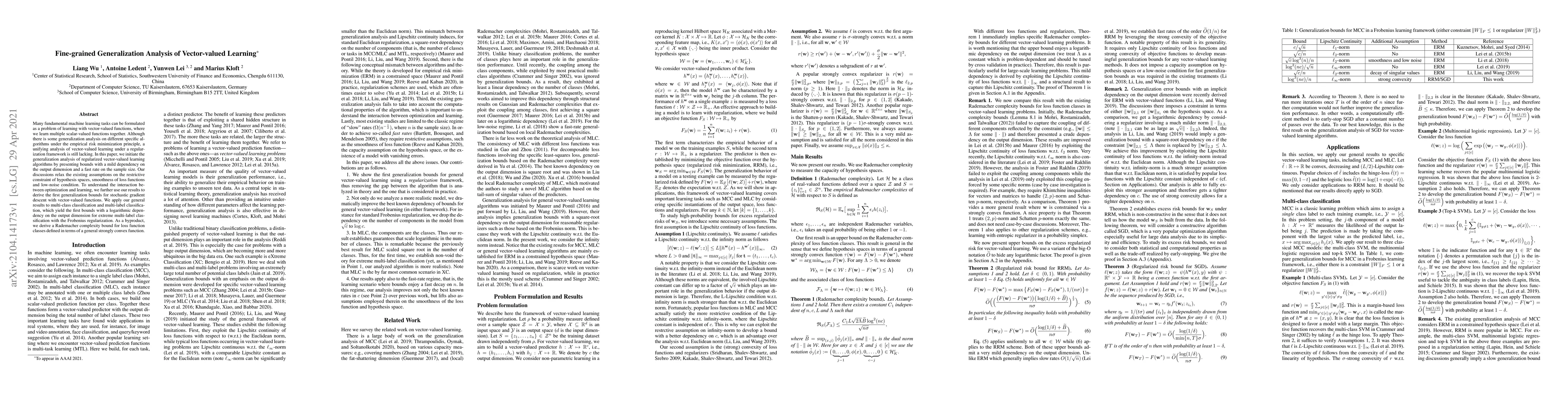 This paper initiates a generalization analysis for regularized vector-valued learning algorithms, presenting bounds that depend mildly on output dimension and rapidly on sample size. It relaxes existing assumptions and applies the results to multi-class and multi-label classification, yielding logarithmic dependency bounds for extreme multi-label classification.