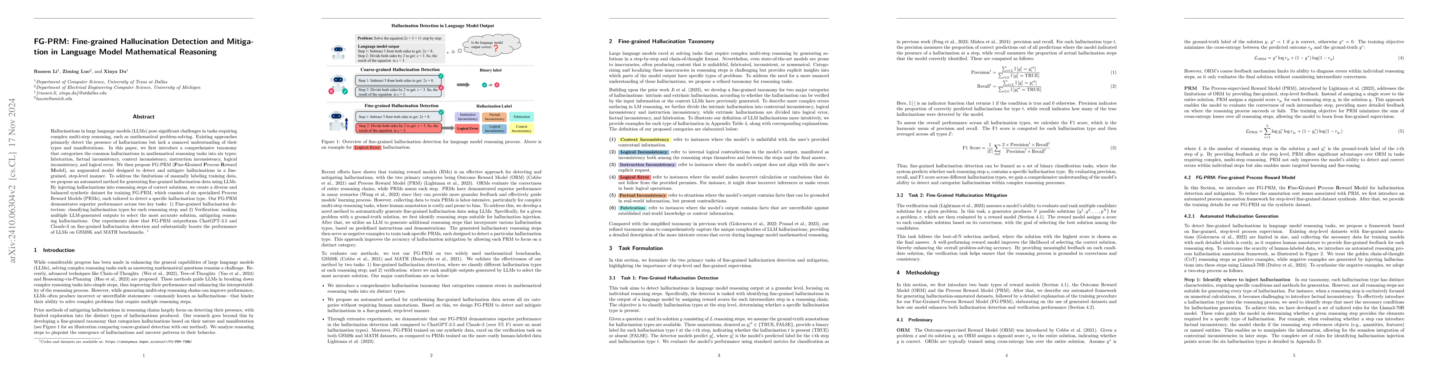 The paper presents a method to detect and mitigate hallucinations in large language models used for mathematical reasoning. It introduces a taxonomy for six types of hallucinations and proposes FG-PRM, a model to fine-grained detect and mitigate these types, outperforming other models on relevant benchmarks.