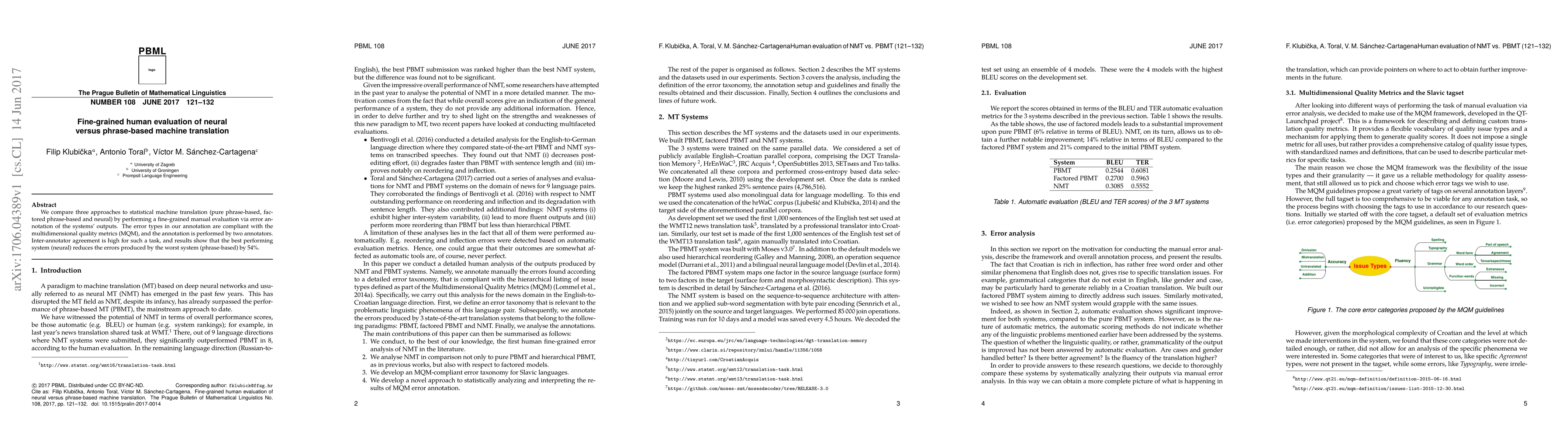 This study compares three machine translation methods—phrase-based, factored phrase-based, and neural—through fine-grained human evaluation, revealing that the neural approach reduces errors by 54% compared to the phrase-based method, with high inter-annotator agreement.