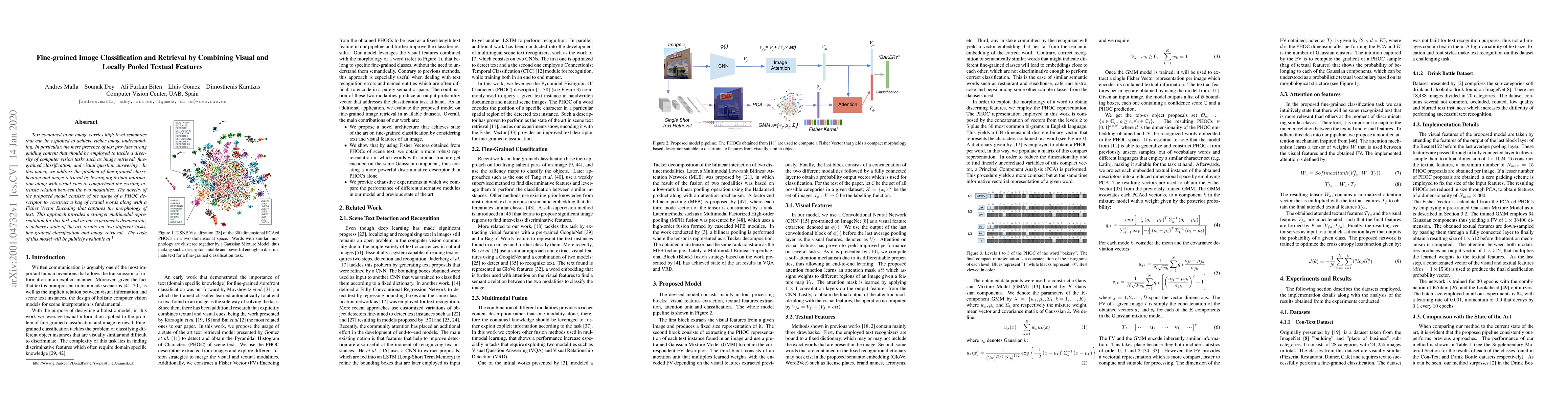 This paper proposes a novel model for fine-grained image classification and retrieval that combines visual and locally pooled textual features using a PHOC descriptor and Fisher Vector Encoding. The approach achieves state-of-the-art results by leveraging the intrinsic relationship between visual and textual information.