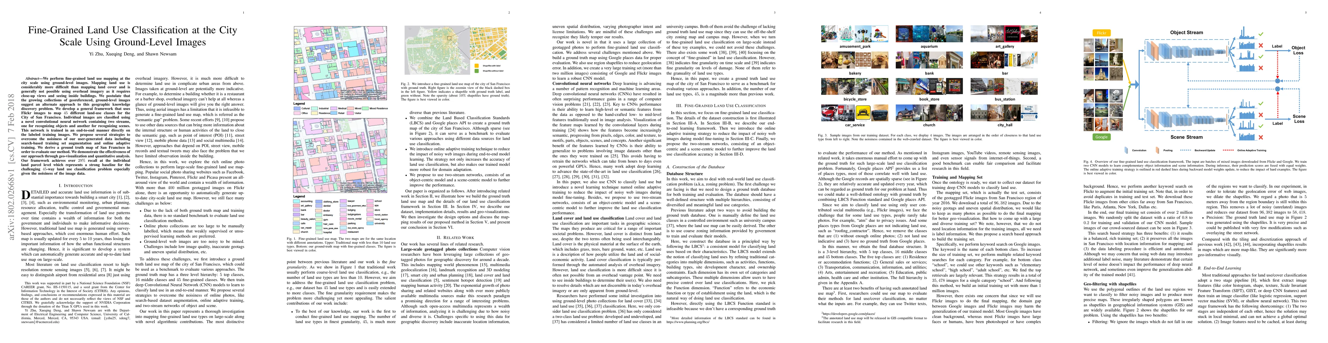 This paper presents a framework for fine-grained land use classification at the city scale using georeferenced, ground-level images from Flickr. It employs a novel convolutional neural network with dual streams to classify 45 land-use classes in San Francisco, achieving over 29% recall, demonstrating a strong baseline for the challenging task.