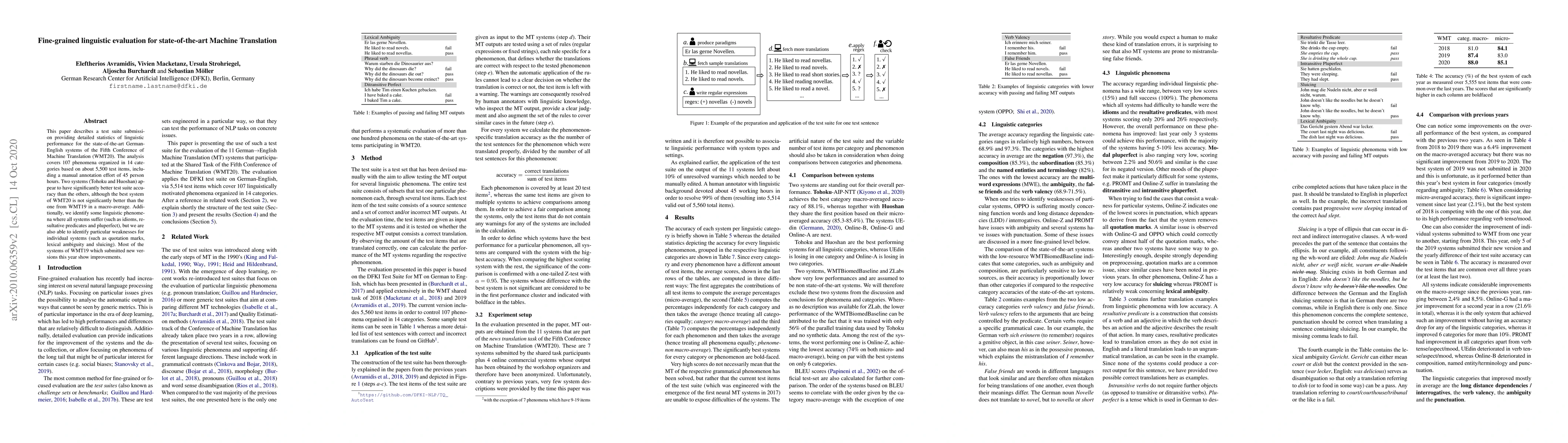This paper describes a test suite submission providing detailed statistics of linguistic performance for the state-of-the-art German-English systems of the Fifth Conference of Machine Translation (WMT20). The analysis covers 107 phenomena organized in 14 categories based on about 5,500 test items, including a manual annotation effort of 45 person hours. Two systems (Tohoku and Huoshan) appear to have significantly better test suite accuracy than the others, although the best system of WMT20 is not significantly better than the one from WMT19 in a macro-average. Additionally, we identify some linguistic phenomena where all systems suffer (such as idioms, resultative predicates and pluperfect), but we are also able to identify particular weaknesses for individual systems (such as quotation marks, lexical ambiguity and sluicing). Most of the systems of WMT19 which submitted new versions this year show improvements.