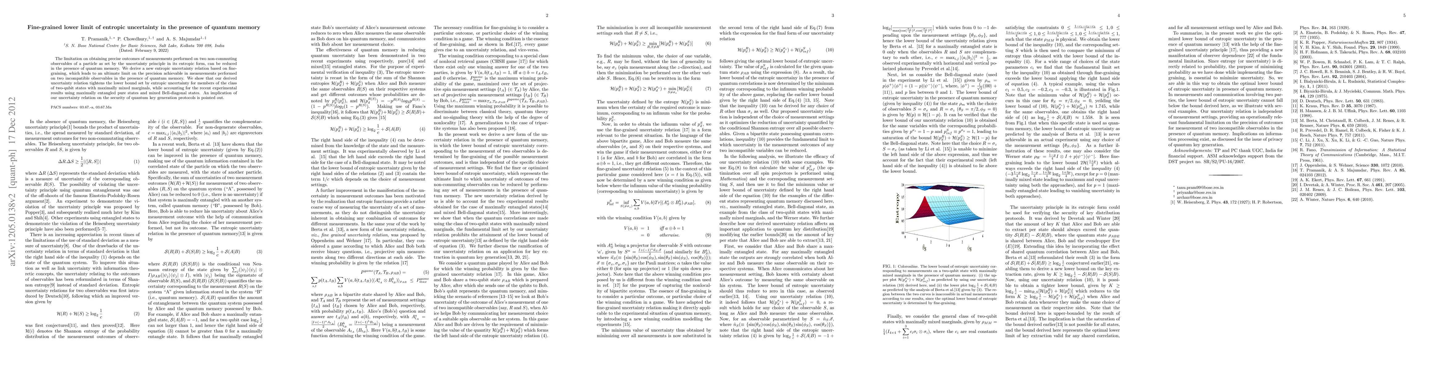 The limitation on obtaining precise outcomes of measurements performed on two non-commuting observables of a particle as set by the uncertainty principle in its entropic form, can be reduced in the presence of quantum memory. We derive a new entropic uncertainty relation based on fine- graining, which leads to an ultimate limit on the precision achievable in measurements performed on two incompatible observables in the presence of quantum memory. We show that our derived uncertainty relation tightens the lower bound set by entropic uncertainty for members of the class of two-qubit states with maximally mixed marginals, while accounting for the recent experimental results using maximally entangled pure states and mixed Bell-diagonal states. An implication of our uncertainty relation on the security of quantum key generation protocols is pointed out.