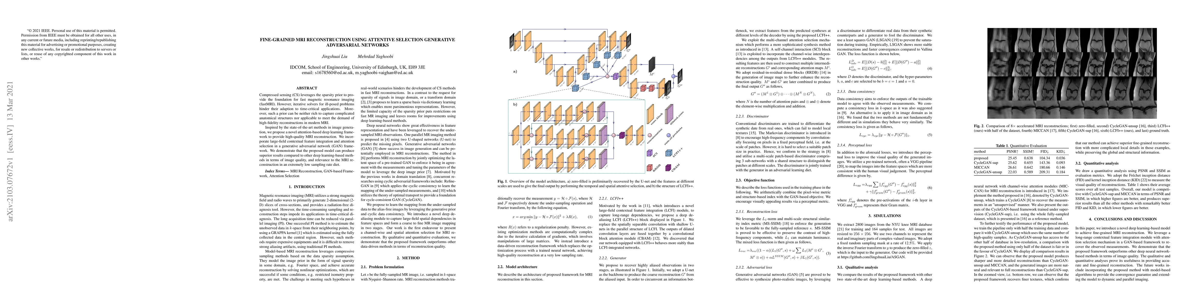 This paper proposes an attention-based deep learning framework for fine-grained MRI reconstruction using generative adversarial networks (GANs) to overcome limitations of traditional compressed sensing methods. The model integrates contextual features and attention selection to achieve high-fidelity reconstructions at low sampling rates, outperforming other deep learning approaches in image quality.