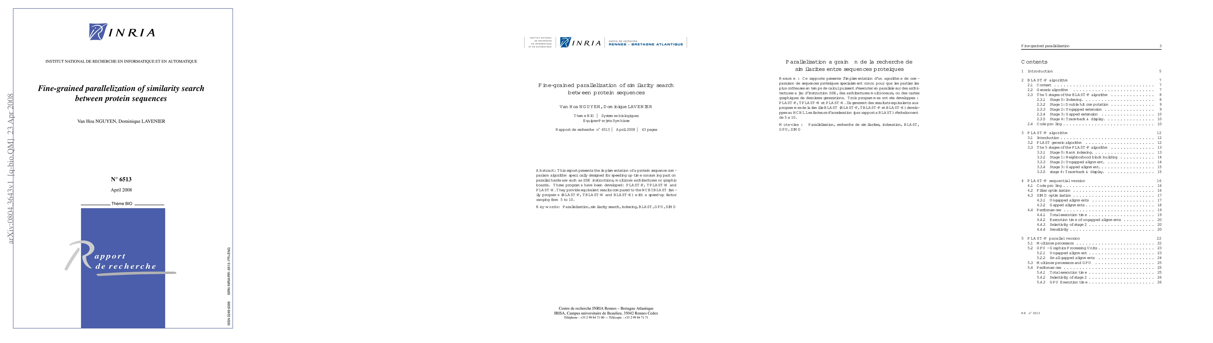 This report presents the implementation of a protein sequence comparison algorithm specifically designed for speeding up time consuming part on parallel hardware such as SSE instructions, multicore architectures or graphic boards. Three programs have been developed: PLAST-P, TPLAST-N and PLAST-X. They provide equivalent results compared to the NCBI BLAST family programs (BLAST-P, TBLAST-N and BLAST-X) with a speed-up factor ranging from 5 to 10.