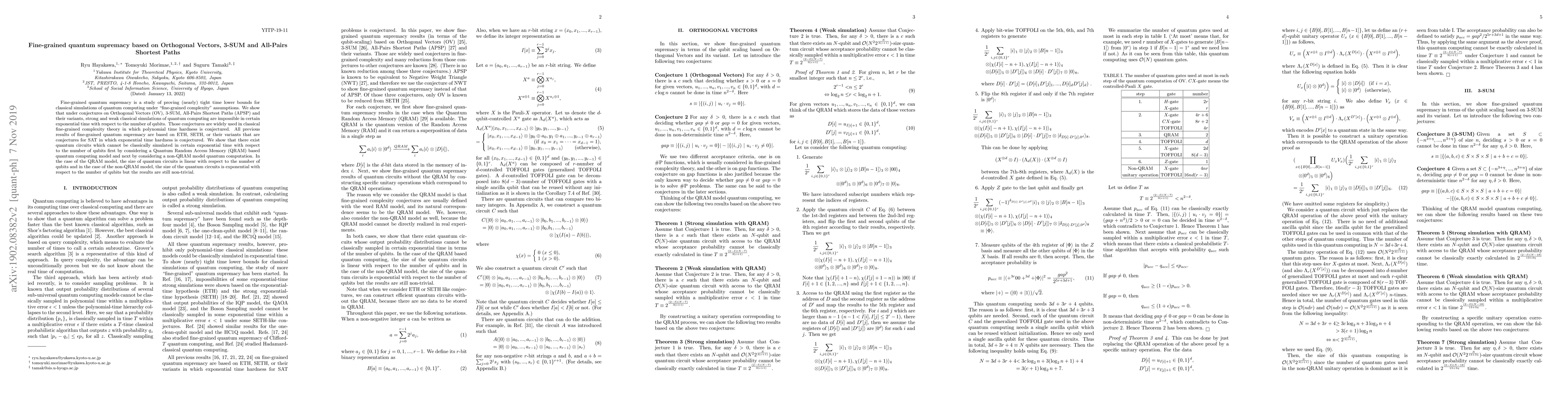 Fine-grained quantum supremacy is a study of proving (nearly) tight time lower bounds for classical simulations of quantum computing under "fine-grained complexity" assumptions. We show that under conjectures on Orthogonal Vectors (OV), 3-SUM, All-Pairs Shortest Paths (APSP) and their variants, strong and weak classical simulations of quantum computing are impossible in certain exponential time with respect to the number of qubits. Those conjectures are widely used in classical fine-grained complexity theory in which polynomial time hardness is conjectured. All previous results of fine-grained quantum supremacy are based on ETH, SETH, or their variants that are conjectures for SAT in which exponential time hardness is conjectured. We show that there exist quantum circuits which cannot be classically simulated in certain exponential time with respect to the number of qubits first by considering a Quantum Random Access Memory (QRAM) based quantum computing model and next by considering a non-QRAM model quantum computation. In the case of the QRAM model, the size of quantum circuits is linear with respect to the number of qubits and in the case of the non-QRAM model, the size of the quantum circuits is exponential with respect to the number of qubits but the results are still non-trivial.