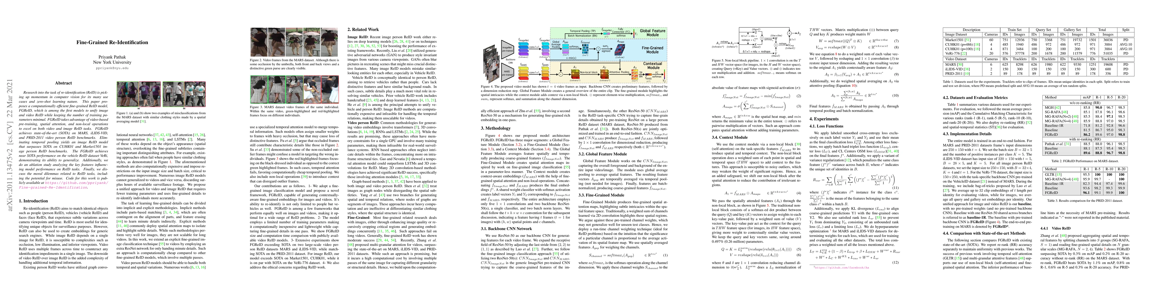 Research into the task of re-identification (ReID) is picking up momentum in computer vision for its many use cases and zero-shot learning nature. This paper proposes a computationally efficient fine-grained ReID model, FGReID, which is among the first models to unify image and video ReID while keeping the number of training parameters minimal. FGReID takes advantage of video-based pre-training and spatial feature attention to improve performance on both video and image ReID tasks. FGReID achieves state-of-the-art (SOTA) on MARS, iLIDS-VID, and PRID-2011 video person ReID benchmarks. Eliminating temporal pooling yields an image ReID model that surpasses SOTA on CUHK01 and Market1501 image person ReID benchmarks. The FGReID achieves near SOTA performance on the vehicle ReID dataset VeRi as well, demonstrating its ability to generalize. Additionally we do an ablation study analyzing the key features influencing model performance on ReID tasks. Finally, we discuss the moral dilemmas related to ReID tasks, including the potential for misuse. Code for this work is publicly available at https: //github.com/ppriyank/Fine-grained-ReIdentification.