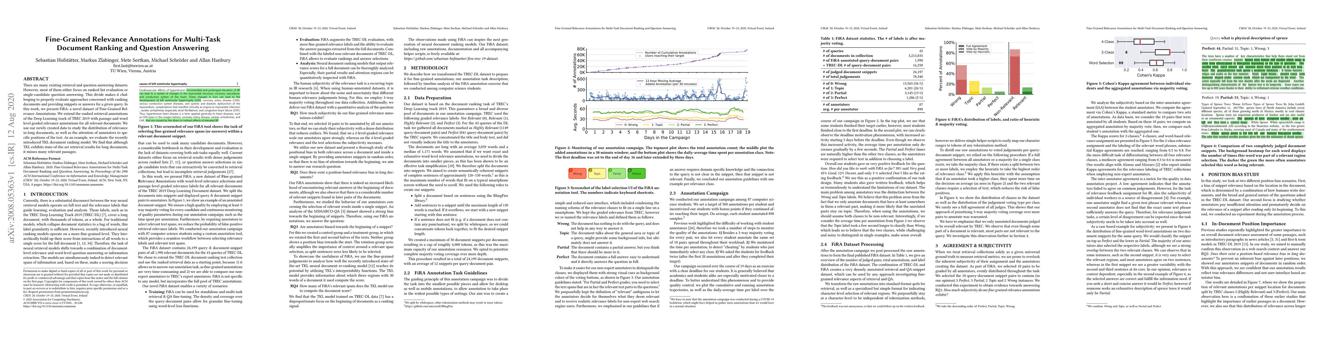 There are many existing retrieval and question answering datasets. However, most of them either focus on ranked list evaluation or single-candidate question answering. This divide makes it challenging to properly evaluate approaches concerned with ranking documents and providing snippets or answers for a given query. In this work, we present FiRA: a novel dataset of Fine-Grained Relevance Annotations. We extend the ranked retrieval annotations of the Deep Learning track of TREC 2019 with passage and word level graded relevance annotations for all relevant documents. We use our newly created data to study the distribution of relevance in long documents, as well as the attention of annotators to specific positions of the text. As an example, we evaluate the recently introduced TKL document ranking model. We find that although TKL exhibits state-of-the-art retrieval results for long documents, it misses many relevant passages.
