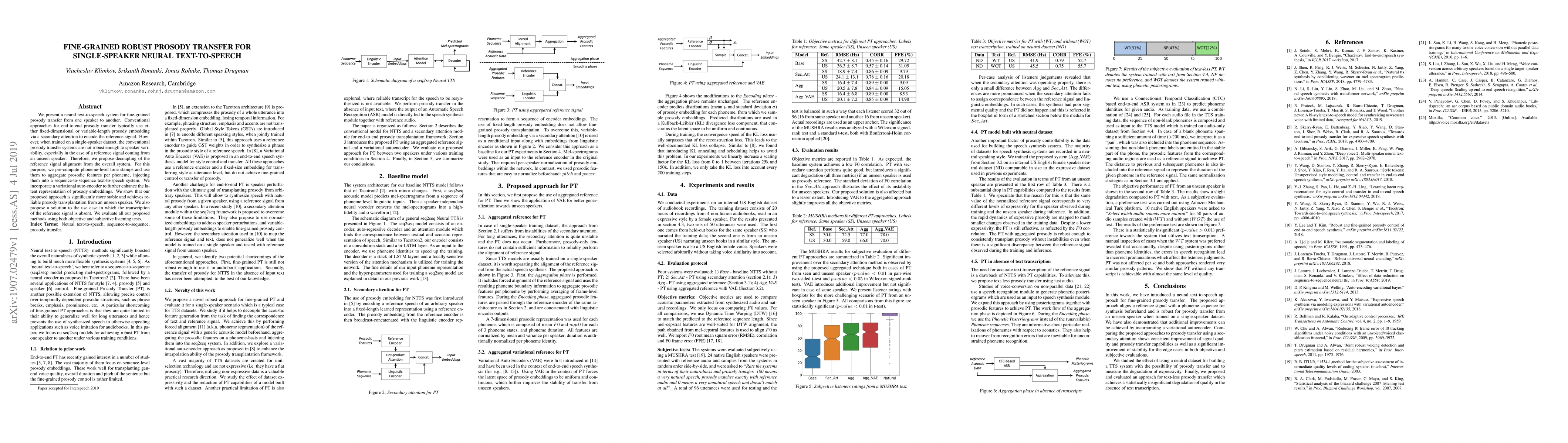 This paper proposes a neural text-to-speech system for fine-grained prosody transfer that enhances robustness to unseen speakers by decoupling reference signal alignment. The approach uses pre-computed phoneme-level time stamps and a variational auto-encoder to improve prosody embeddings, achieving stable and reliable prosody transplantation.