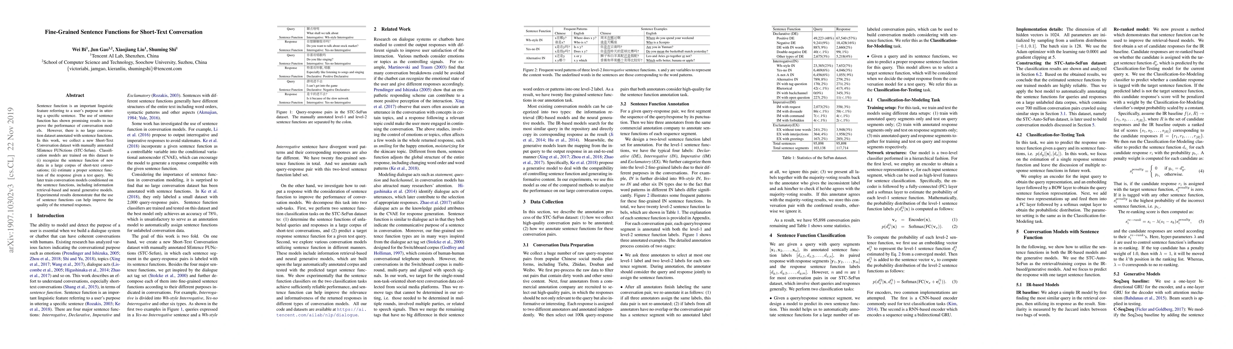 This paper introduces STC-Sefun, a new dataset for short-text conversations annotated with sentence functions to improve conversation models. Models trained on this dataset show enhanced performance in recognizing sentence functions and generating better responses.