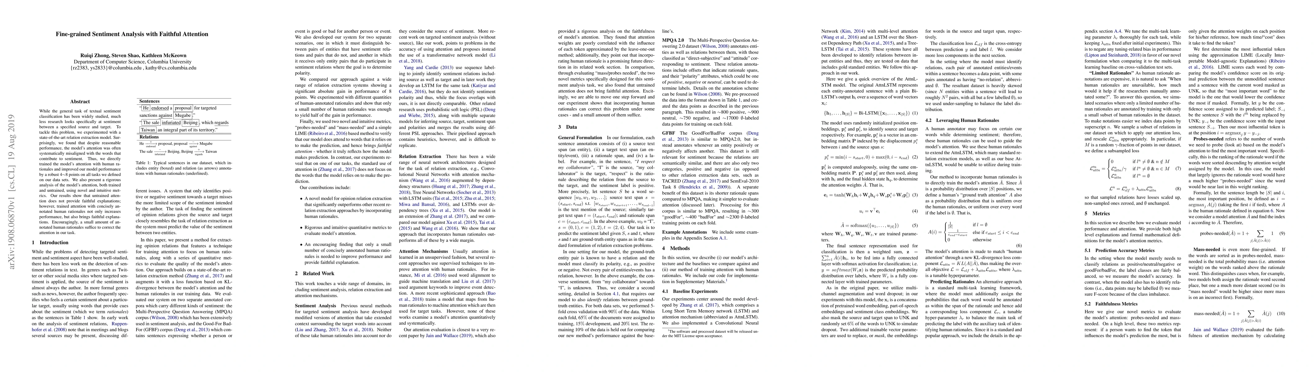 While the general task of textual sentiment classification has been widely studied, much less research looks specifically at sentiment between a specified source and target. To tackle this problem, we experimented with a state-of-the-art relation extraction model. Surprisingly, we found that despite reasonable performance, the model's attention was often systematically misaligned with the words that contribute to sentiment. Thus, we directly trained the model's attention with human rationales and improved our model performance by a robust 4~8 points on all tasks we defined on our data sets. We also present a rigorous analysis of the model's attention, both trained and untrained, using novel and intuitive metrics. Our results show that untrained attention does not provide faithful explanations; however, trained attention with concisely annotated human rationales not only increases performance, but also brings faithful explanations. Encouragingly, a small amount of annotated human rationales suffice to correct the attention in our task.
