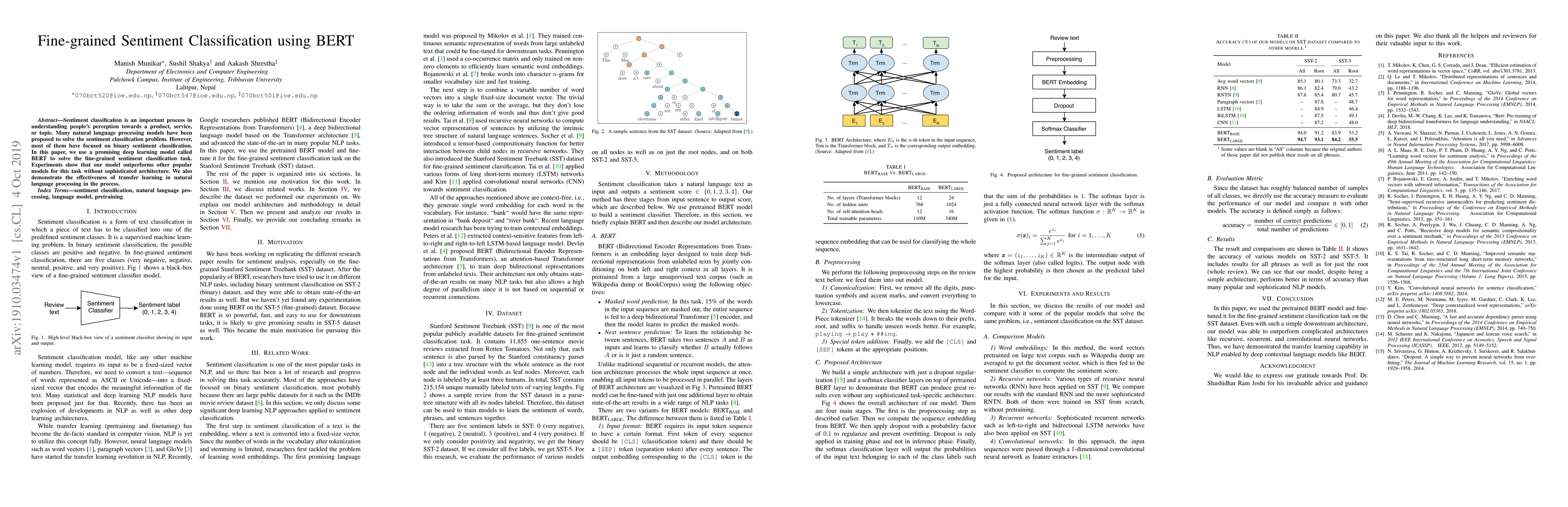 Sentiment classification is an important process in understanding people's perception towards a product, service, or topic. Many natural language processing models have been proposed to solve the sentiment classification problem. However, most of them have focused on binary sentiment classification. In this paper, we use a promising deep learning model called BERT to solve the fine-grained sentiment classification task. Experiments show that our model outperforms other popular models for this task without sophisticated architecture. We also demonstrate the effectiveness of transfer learning in natural language processing in the process.