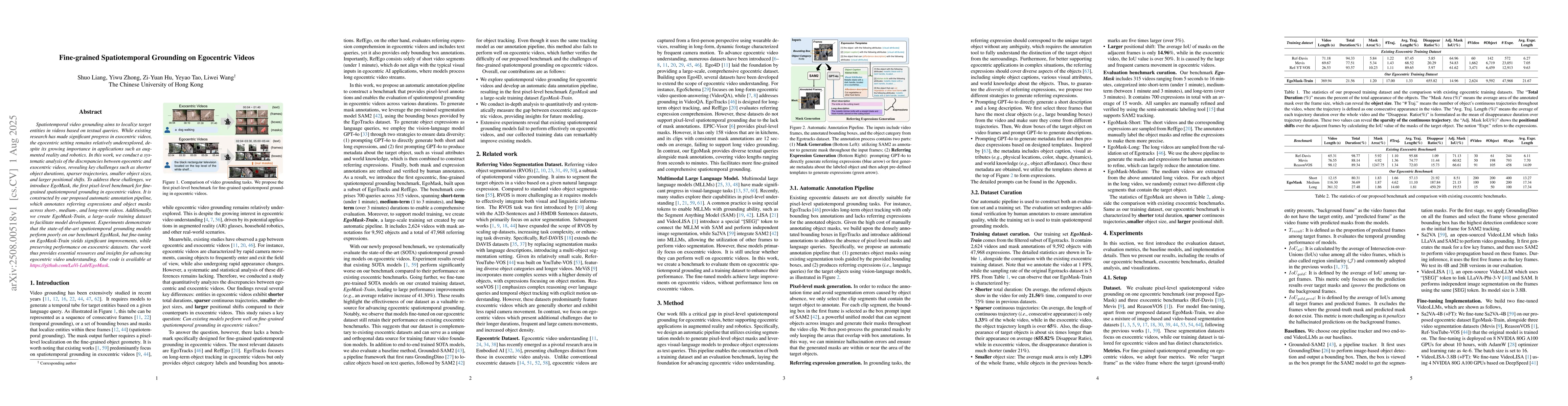 Spatiotemporal video grounding aims to localize target entities in videos based on textual queries. While existing research has made significant progress in exocentric videos, the egocentric setting remains relatively underexplored, despite its growing importance in applications such as augmented reality and robotics. In this work, we conduct a systematic analysis of the discrepancies between egocentric and exocentric videos, revealing key challenges such as shorter object durations, sparser trajectories, smaller object sizes, and larger positional shifts. To address these challenges, we introduce EgoMask, the first pixel-level benchmark for fine-grained spatiotemporal grounding in egocentric videos. It is constructed by our proposed automatic annotation pipeline, which annotates referring expressions and object masks across short-, medium-, and long-term videos. Additionally, we create EgoMask-Train, a large-scale training dataset to facilitate model development. Experiments demonstrate that the state-of-the-art spatiotemporal grounding models perform poorly on our benchmark EgoMask, but fine-tuning on EgoMask-Train yields significant improvements, while preserving performance on exocentric datasets. Our work thus provides essential resources and insights for advancing egocentric video understanding. Our code is available at https://github.com/LaVi-Lab/EgoMask .
