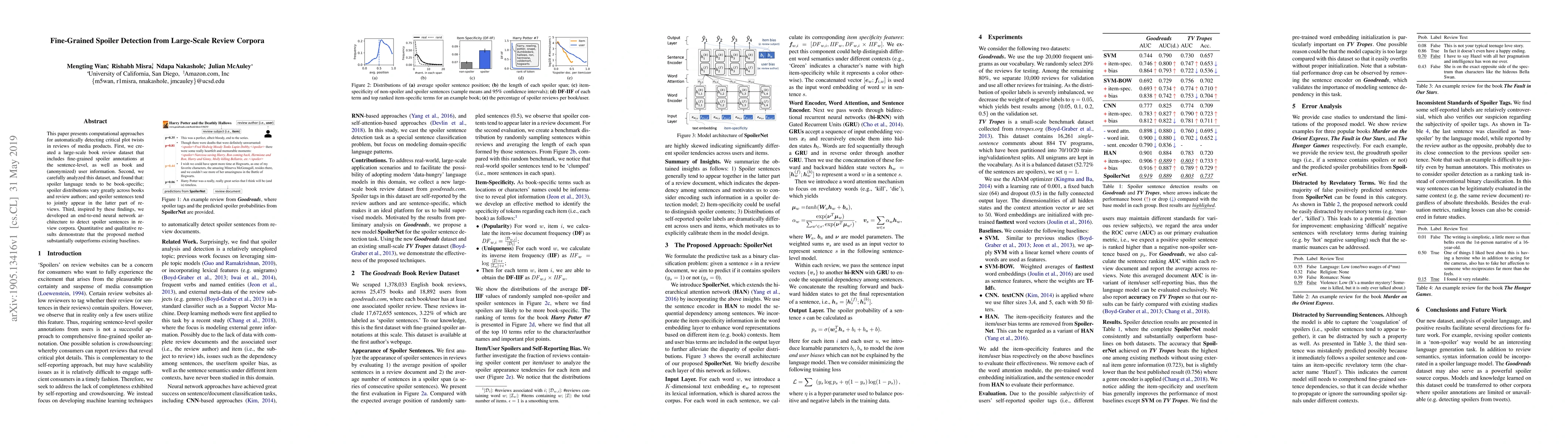 This paper presents computational approaches for automatically detecting critical plot twists in reviews of media products. First, we created a large-scale book review dataset that includes fine-grained spoiler annotations at the sentence-level, as well as book and (anonymized) user information. Second, we carefully analyzed this dataset, and found that: spoiler language tends to be book-specific; spoiler distributions vary greatly across books and review authors; and spoiler sentences tend to jointly appear in the latter part of reviews. Third, inspired by these findings, we developed an end-to-end neural network architecture to detect spoiler sentences in review corpora. Quantitative and qualitative results demonstrate that the proposed method substantially outperforms existing baselines.