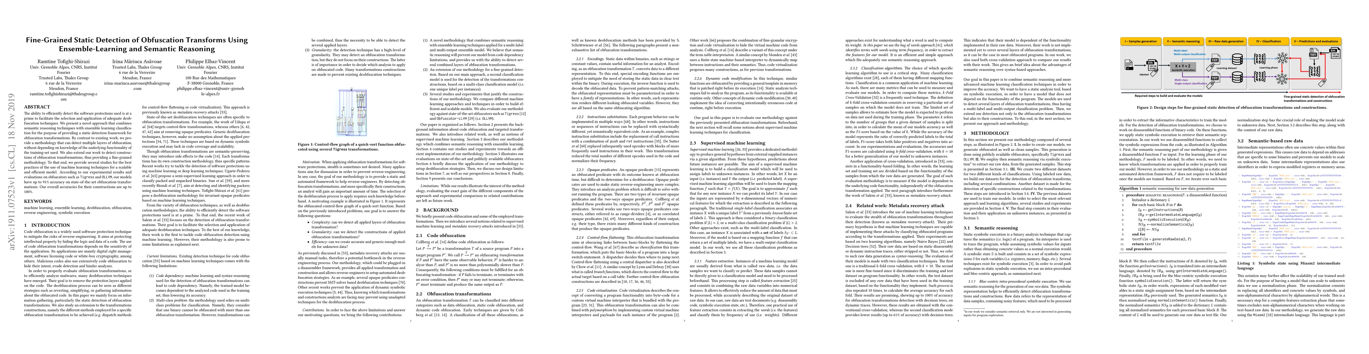 The ability to efficiently detect the software protections used is at a prime to facilitate the selection and application of adequate deob-fuscation techniques. We present a novel approach that combines semantic reasoning techniques with ensemble learning classification for the purpose of providing a static detection framework for obfuscation transformations. By contrast to existing work, we provide a methodology that can detect multiple layers of obfuscation, without depending on knowledge of the underlying functionality of the training-set used. We also extend our work to detect constructions of obfuscation transformations, thus providing a fine-grained methodology. To that end, we provide several studies for the best practices of the use of machine learning techniques for a scalable and efficient model. According to our experimental results and evaluations on obfuscators such as Tigress and OLLVM, our models have up to 91% accuracy on state-of-the-art obfuscation transformations. Our overall accuracies for their constructions are up to 100%.
