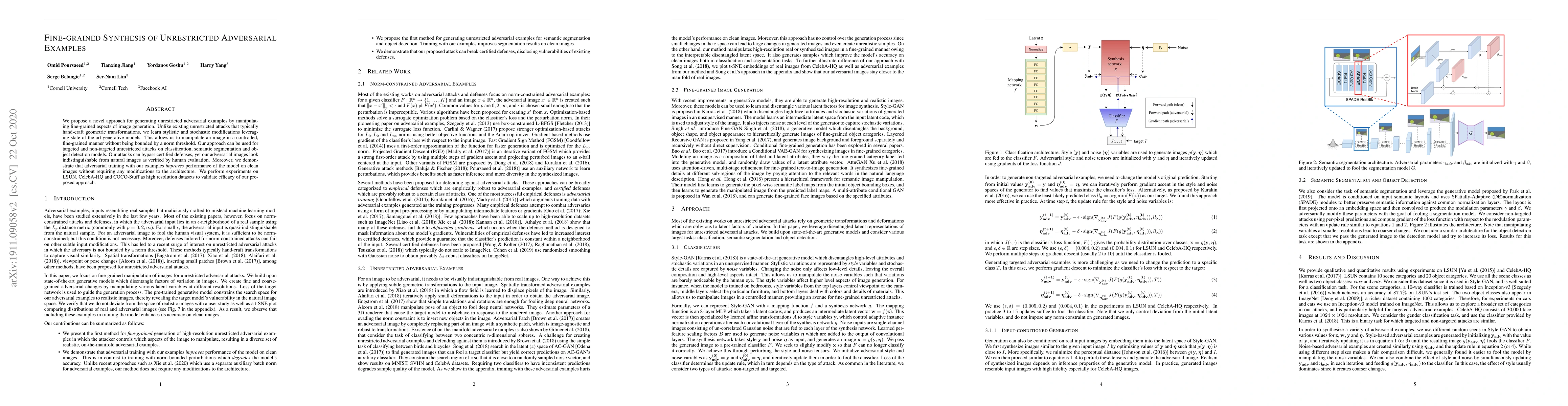 This paper introduces a novel method for generating fine-grained, unrestricted adversarial examples using generative models to manipulate image details, bypassing defenses while remaining indistinguishable to humans. The approach enhances model performance through adversarial training without architectural changes.