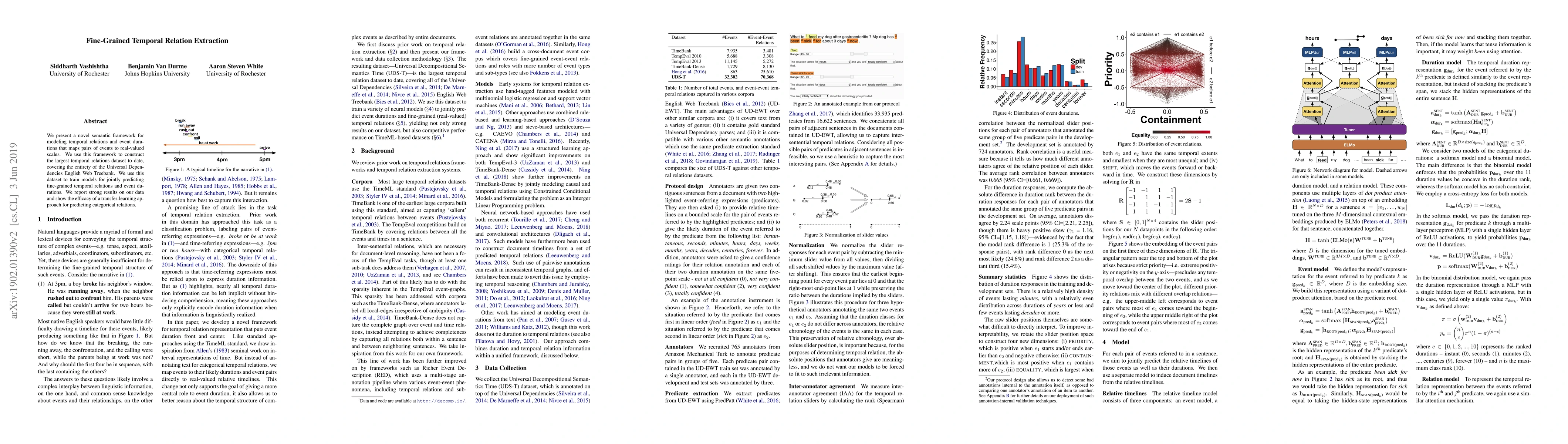 This paper introduces a semantic framework for fine-grained temporal relation extraction, mapping event pairs to real-valued scales, and constructs a large dataset from the Universal Dependencies English Web Treebank. The authors train models to predict temporal relations and event durations, demonstrating strong performance and the effectiveness of transfer learning for categorical relation predictions.