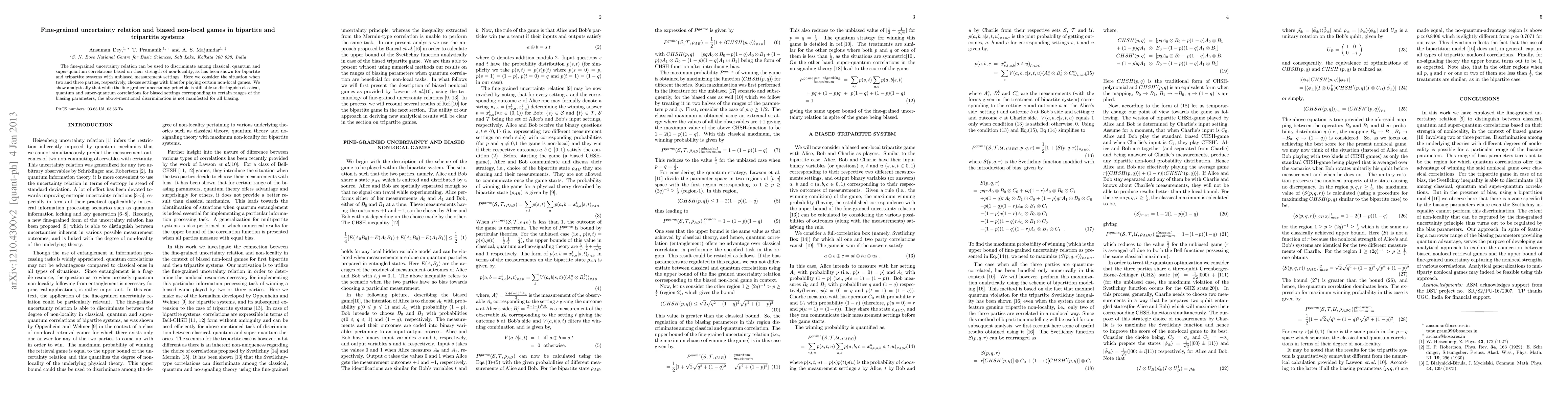This paper examines how fine-grained uncertainty relations differentiate classical, quantum, and super-quantum correlations in non-local games under biased measurement settings for bipartite and tripartite systems. It analytically demonstrates that while discrimination is possible within specific bias ranges, it fails universally across all biases.