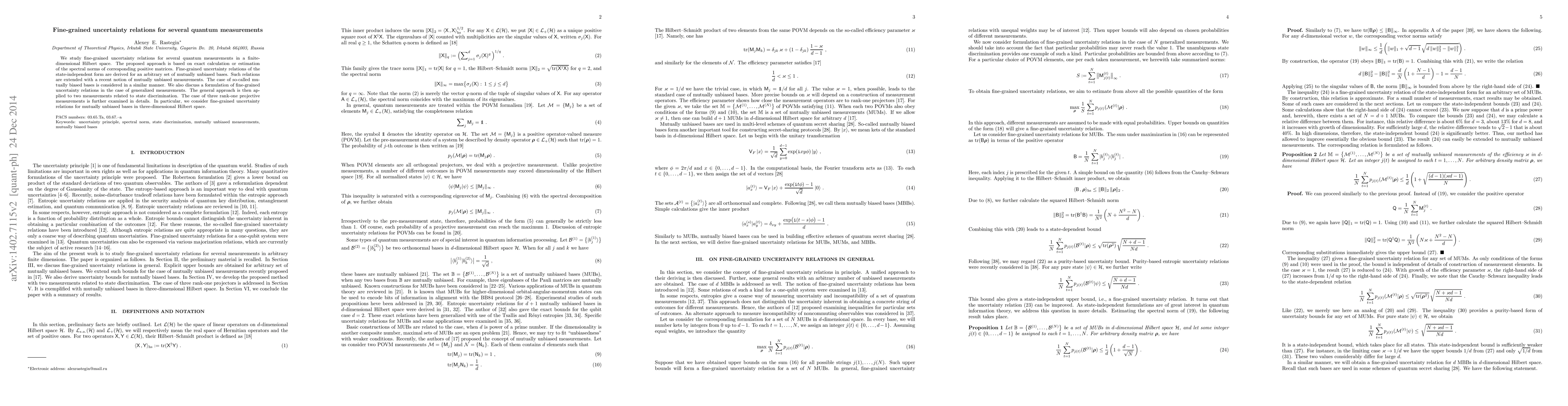 This paper explores fine-grained uncertainty relations for multiple quantum measurements in finite-dimensional Hilbert spaces, deriving state-independent relations for mutually unbiased bases and generalized measurements. It also examines the case of mutually biased bases and applies the methodology to state discrimination and three-dimensional projective measurements.