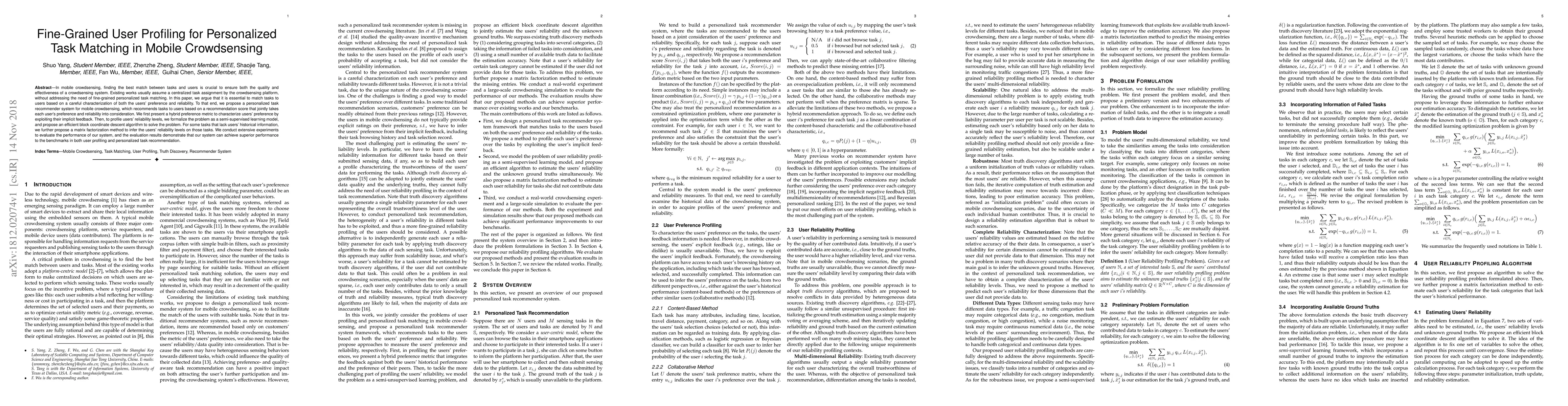 This research introduces a personalized task recommender system for mobile crowdsensing that matches tasks to users based on a detailed analysis of user preferences and reliability. The system utilizes a hybrid preference metric and a semi-supervised learning model, along with a matrix factorization method for tasks lacking historical data, to achieve superior performance in user profiling and personalized task matching.