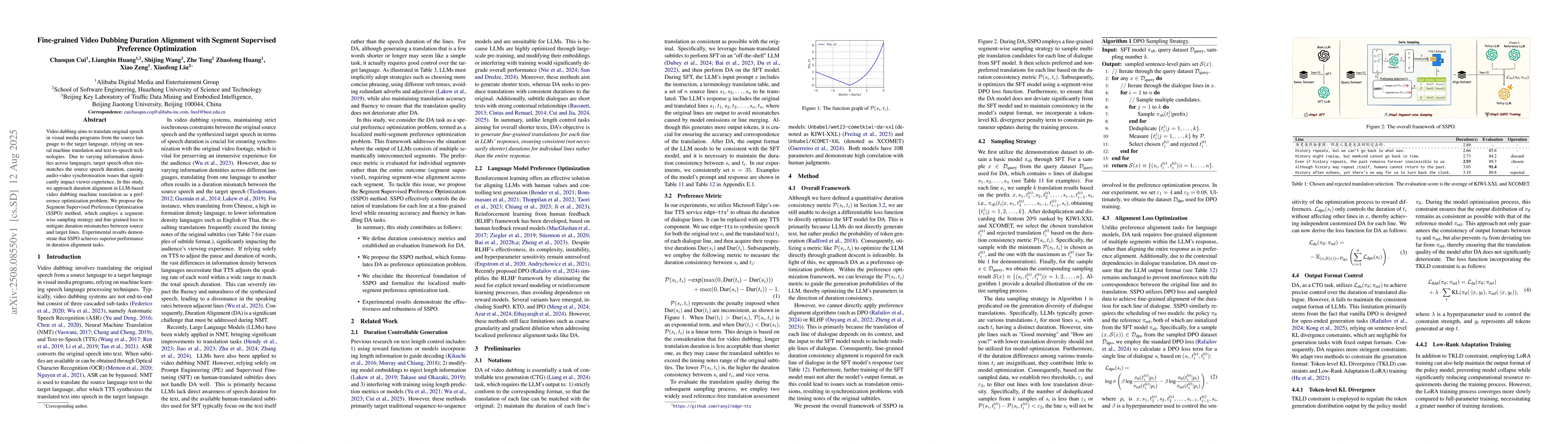 Video dubbing aims to translate original speech in visual media programs from the source language to the target language, relying on neural machine translation and text-to-speech technologies. Due to varying information densities across languages, target speech often mismatches the source speech duration, causing audio-video synchronization issues that significantly impact viewer experience. In this study, we approach duration alignment in LLM-based video dubbing machine translation as a preference optimization problem. We propose the Segment Supervised Preference Optimization (SSPO) method, which employs a segment-wise sampling strategy and fine-grained loss to mitigate duration mismatches between source and target lines. Experimental results demonstrate that SSPO achieves superior performance in duration alignment tasks.