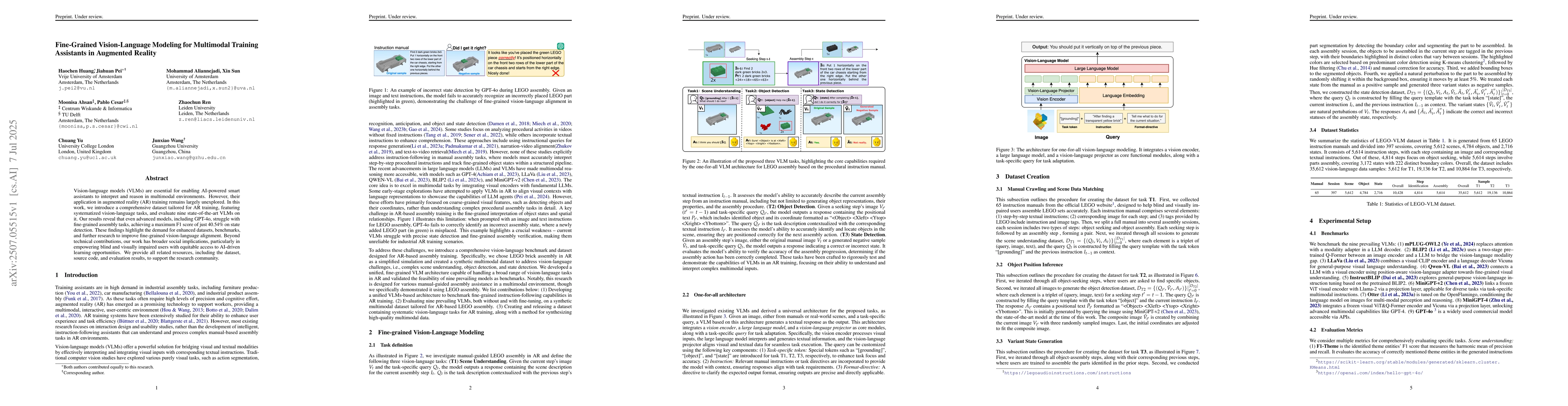 Vision-language models (VLMs) are essential for enabling AI-powered smart assistants to interpret and reason in multimodal environments. However, their application in augmented reality (AR) training remains largely unexplored. In this work, we introduce a comprehensive dataset tailored for AR training, featuring systematized vision-language tasks, and evaluate nine state-of-the-art VLMs on it. Our results reveal that even advanced models, including GPT-4o, struggle with fine-grained assembly tasks, achieving a maximum F1 score of just 40.54% on state detection. These findings highlight the demand for enhanced datasets, benchmarks, and further research to improve fine-grained vision-language alignment. Beyond technical contributions, our work has broader social implications, particularly in empowering blind and visually impaired users with equitable access to AI-driven learning opportunities. We provide all related resources, including the dataset, source code, and evaluation results, to support the research community.