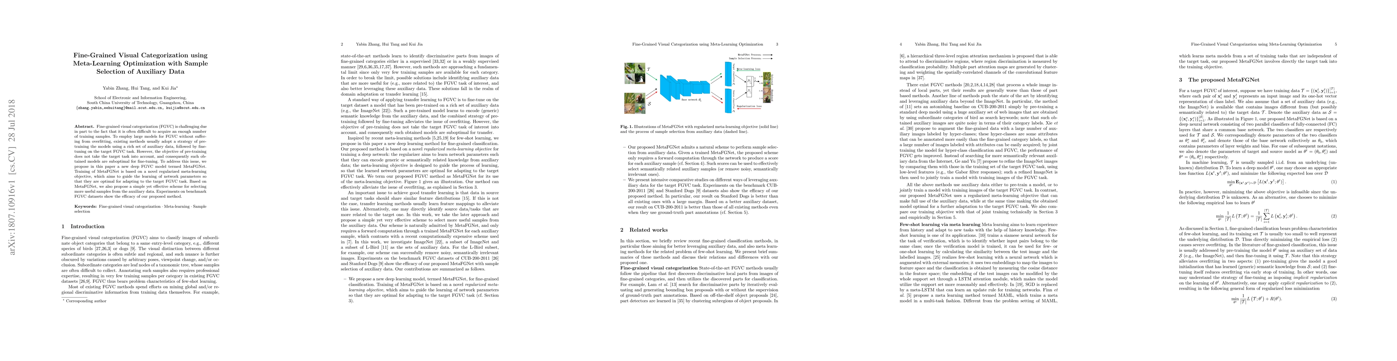 Fine-grained visual categorization (FGVC) is challenging due in part to the fact that it is often difficult to acquire an enough number of training samples. To employ large models for FGVC without suffering from overfitting, existing methods usually adopt a strategy of pre-training the models using a rich set of auxiliary data, followed by fine-tuning on the target FGVC task. However, the objective of pre-training does not take the target task into account, and consequently such obtained models are suboptimal for fine-tuning. To address this issue, we propose in this paper a new deep FGVC model termed MetaFGNet. Training of MetaFGNet is based on a novel regularized meta-learning objective, which aims to guide the learning of network parameters so that they are optimal for adapting to the target FGVC task. Based on MetaFGNet, we also propose a simple yet effective scheme for selecting more useful samples from the auxiliary data. Experiments on benchmark FGVC datasets show the efficacy of our proposed method.