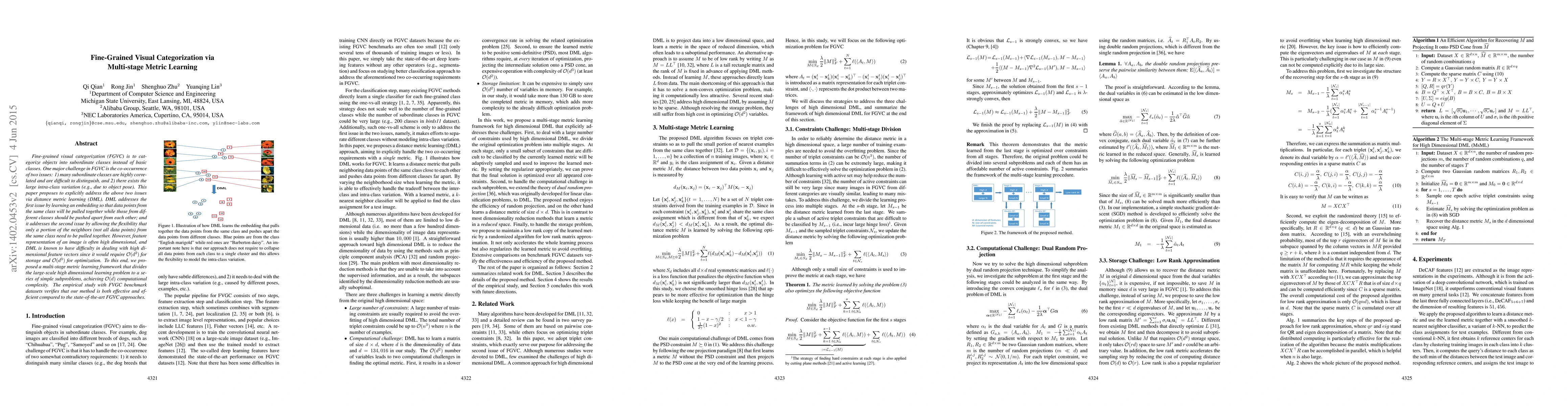 This paper proposes a multi-stage metric learning framework for fine-grained visual categorization, addressing the challenges of high intra-class variation and class correlation. The method efficiently divides the high-dimensional learning problem into simpler subproblems, achieving lower computational complexity and improving categorization accuracy.
