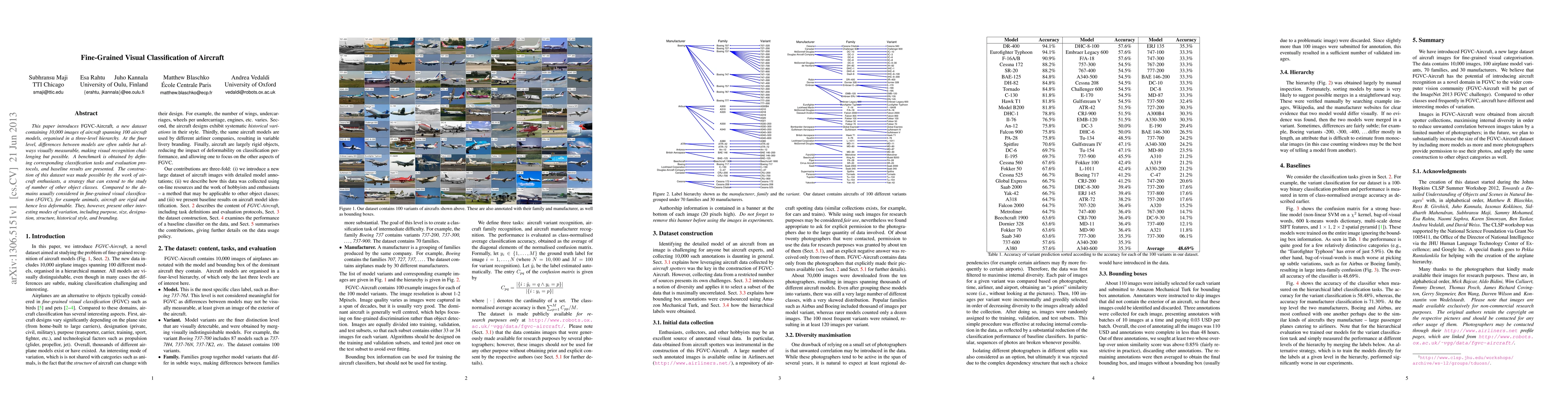 This paper presents FGVC-Aircraft, a dataset of 10,000 images of 100 aircraft models, organized in a three-level hierarchy, highlighting subtle visual differences. The study introduces a benchmark for fine-grained visual classification and showcases baseline results, emphasizing the potential for similar strategies in other object classes.