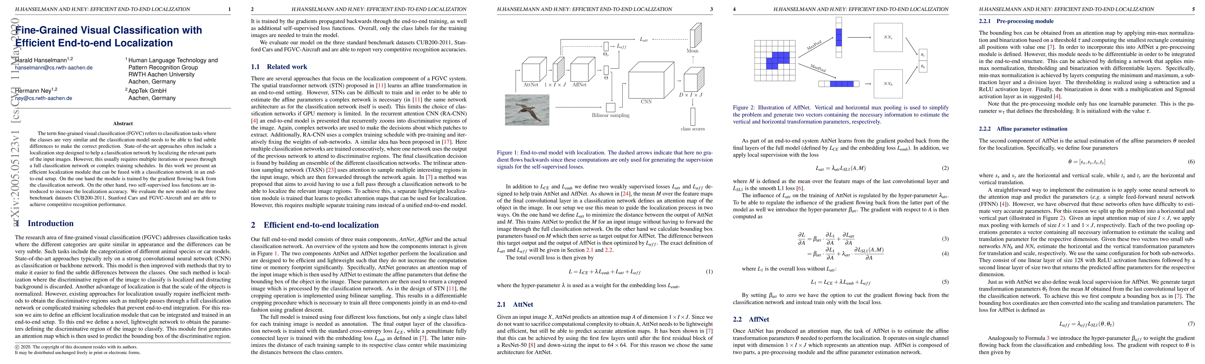 This paper proposes an efficient end-to-end localization module for fine-grained visual classification, trained with self-supervised loss functions and gradient feedback from the classification network, achieving competitive performance on benchmark datasets.