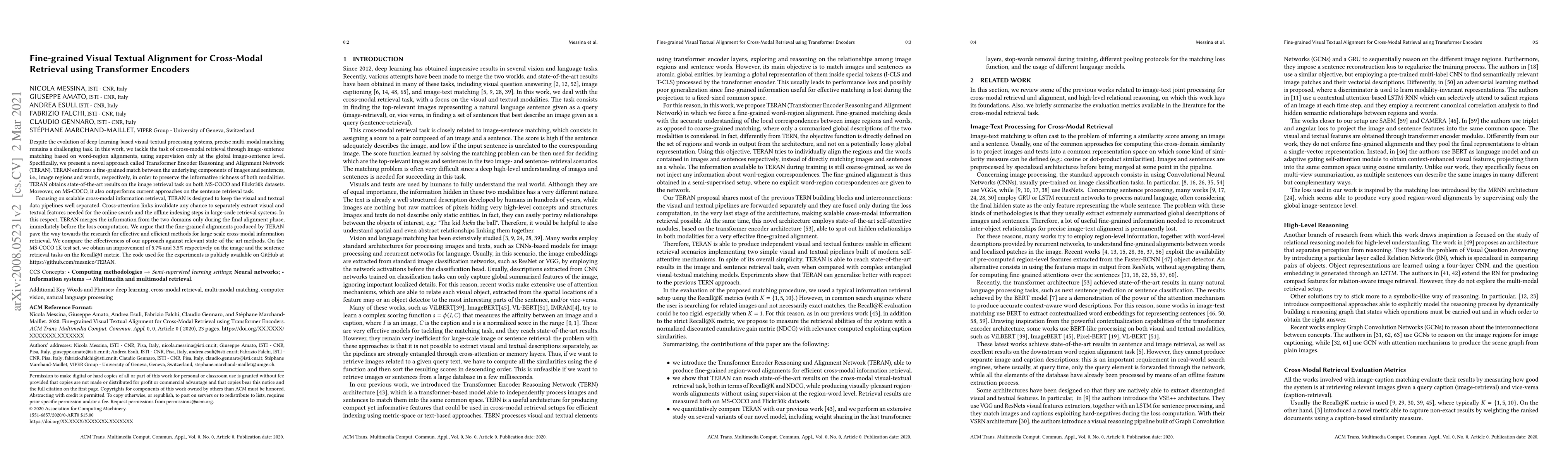 This paper proposes TERAN, a Transformer Encoder Reasoning and Alignment Network for fine-grained visual-textual alignment in cross-modal retrieval. TERAN achieves state-of-the-art performance by separately processing visual and textual features and merging them only for final alignment, enhancing scalability for large-scale retrieval systems.