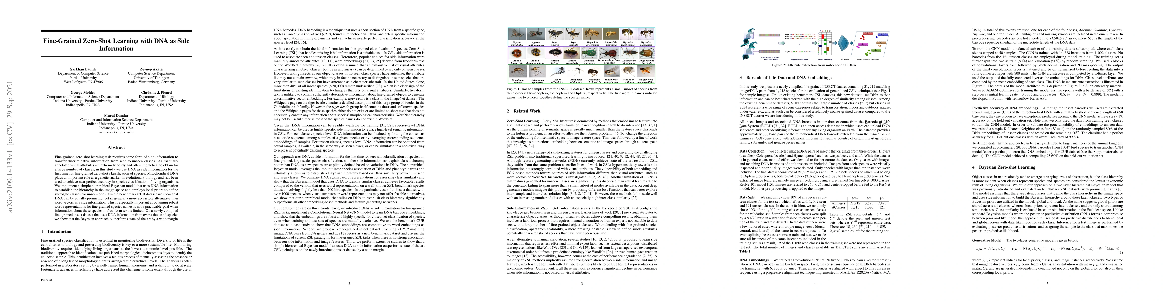 This study introduces a novel use of DNA as side information for fine-grained zero-shot learning, demonstrating its effectiveness for species classification. A hierarchical Bayesian model leverages DNA to define surrogate classes for unseen species, outperforming state-of-the-art methods on benchmark datasets.