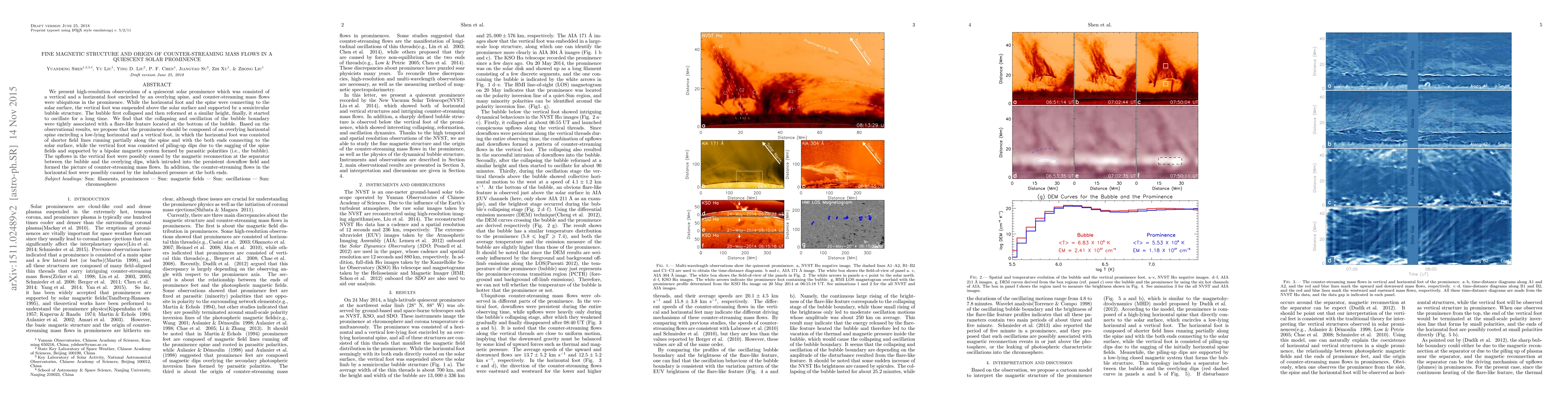 This study presents high-resolution observations of a quiescent solar prominence featuring counter-streaming mass flows, suggesting that the flows are caused by magnetic reconnection and pressure imbalances. The prominence's structure includes a vertical foot supported by a bubble, which oscillates and interacts with a flare-like feature at its base.