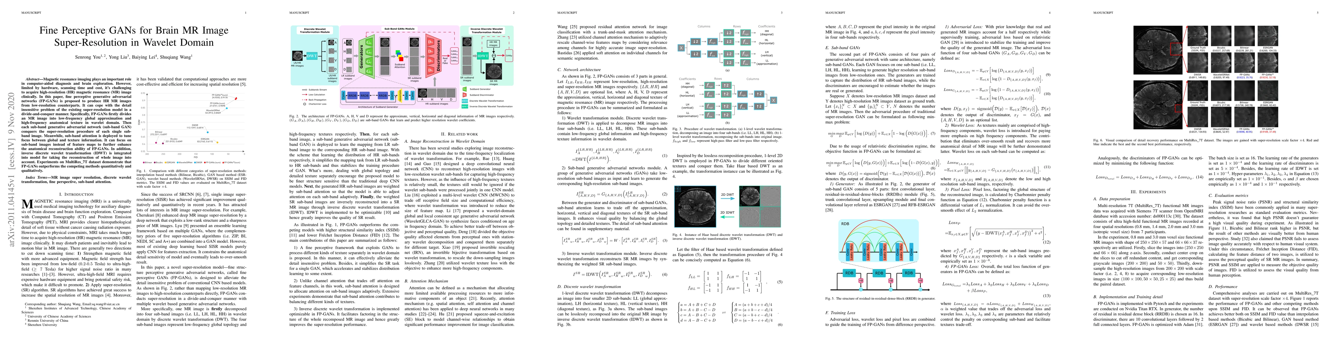This paper proposes fine perceptive generative adversarial networks (FP-GANs) for super-resolution of brain MR images in the wavelet domain, addressing the detail-insensitive issue of existing models. The method divides MR images into low- and high-frequency components, using sub-band GANs and sub-band attention to enhance anatomical reconstruction, followed by inverse discrete wavelet transformation for whole image reconstruction. Experiments show FP-GANs outperform other methods.