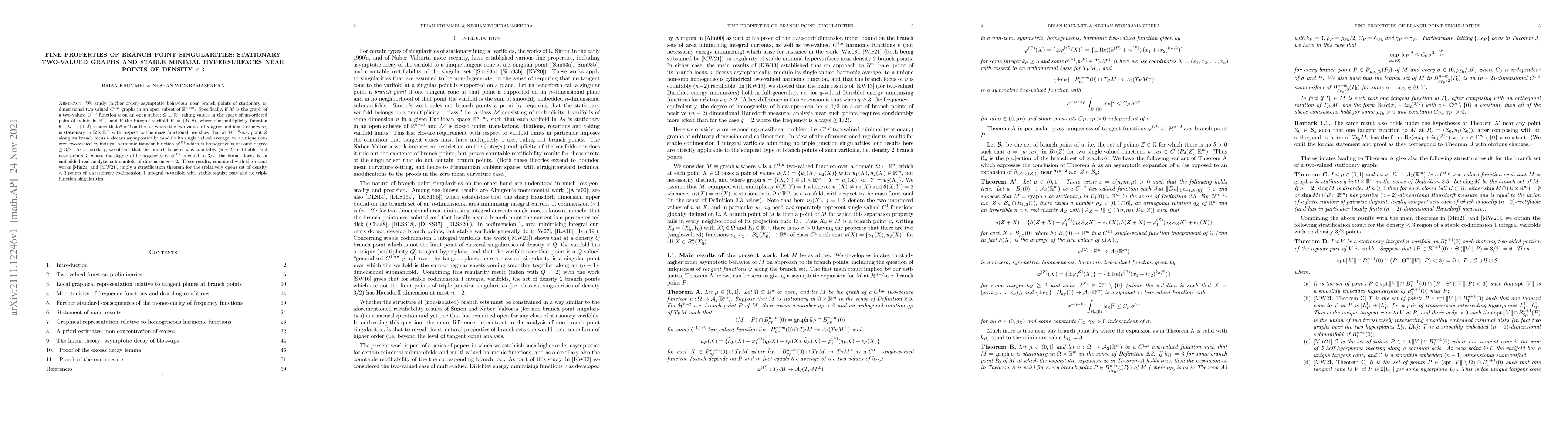This paper investigates the asymptotic behavior near branch points of stationary two-valued $C^{1, \mu}$ graphs, showing that the function decays to a unique cylindrical harmonic tangent function of degree $\geq 3/2$. It concludes with a stratification theorem for points of density less than 3 in stationary codimension 1 integral varifolds.