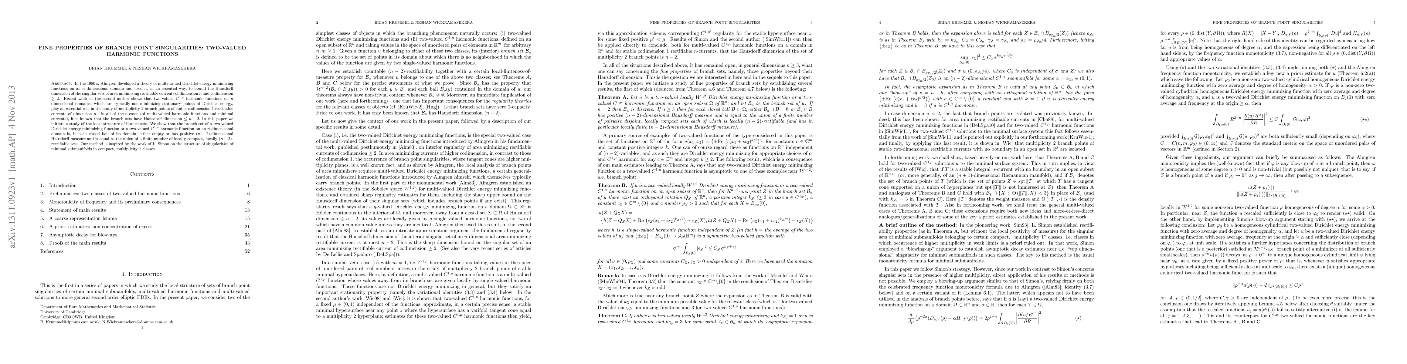 In the 1980's, Almgren developed a theory of multi-valued Dirichlet energy minimizing functions on $n$ dimensional domains and used it, in an essential way, to bound the Hausdorff dimension of the singular sets of area minimizing rectifiable currents of dimension $n$ and codimension $\geq 2$. Recent work of the second author shows that two-valued $C^{1, \mu}$ harmonic functions on $n$ dimensional domains, which are typically-non-minimizing stationary points of Dirichlet energy, play an essential role in the study of multiplicity 2 branch points of stable codimension 1 rectifiable currents of dimension $n$. In all of these cases (of multi-valued harmonic functions and minimal currents), it is known that the branch sets have Hausdorff dimension $\leq n-2.$ In this paper we initiate a study of the local structure of branch sets. We show that the branch set of a two-valued Dirichlet energy minimizing function or a two-valued $C^{1, \mu}$ harmonic function, in each closed ball of its domain, is either empty or has positive $(n-2)$-dimensional Hausdorff measure and is equal to the union of a finite number of locally compact, locally $(n-2)$-rectifiable sets. Our method is inspired by the work of L. Simon on the structure of singularities of minimal submanifolds in compact, multiplicity 1 classes.