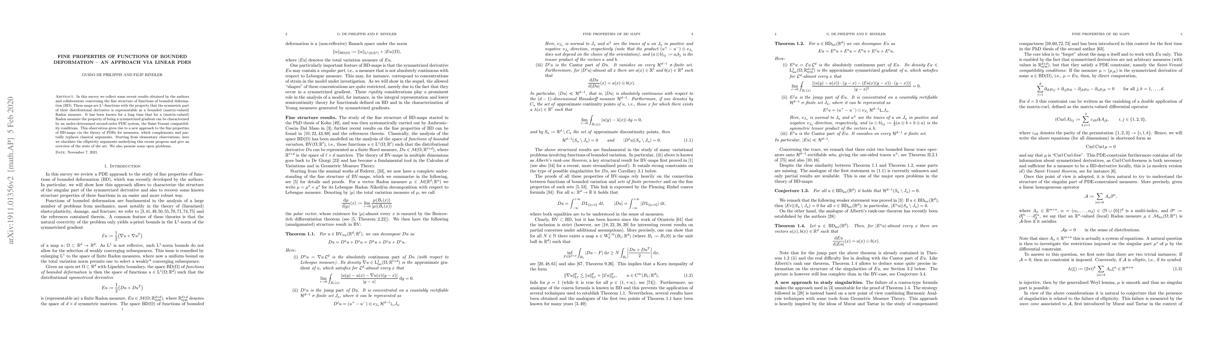 In this survey we collect some recent results obtained by the authors and collaborators concerning the fine structure of functions of bounded deformation (BD). These maps are $\mathrm{L}^1$-functions with the property that the symmetric part of their distributional derivative is representable as a bounded (matrix-valued) Radon measure. It has been known for a long time that for a (matrix-valued) Radon measure the property of being a symmetrized gradient can be characterized by an under-determined second-order PDE system, the Saint-Venant compatibility conditions. This observation gives rise to a new approach to the fine properties of BD-maps via the theory of PDEs for measures, which complements and partially replaces classical arguments. Starting from elementary observations, here we elucidate the ellipticity arguments underlying this recent progress and give an overview of the state of the art. We also present some open problems.