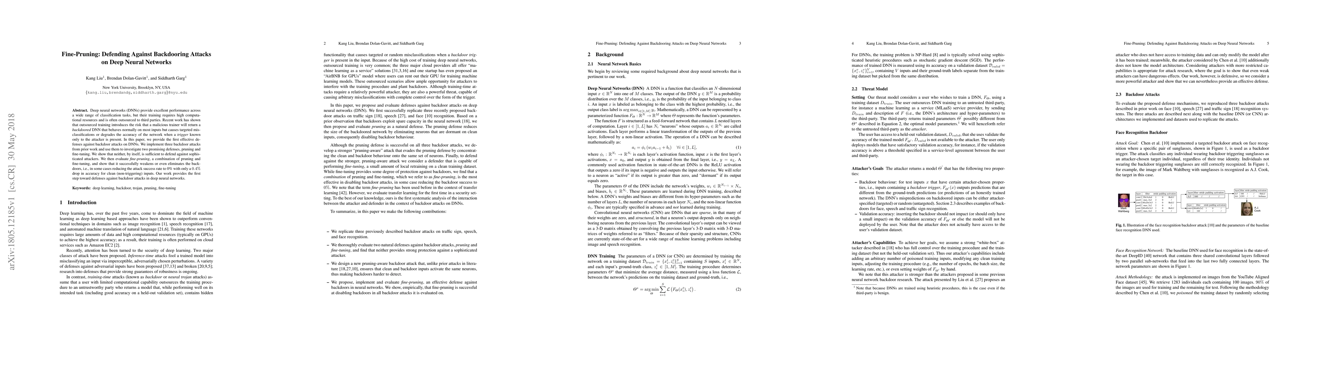 This paper introduces fine-pruning as an effective defense against backdoor attacks on deep neural networks, demonstrating that combining pruning and fine-tuning can significantly weaken or eliminate backdoors with minimal loss in accuracy for clean inputs.