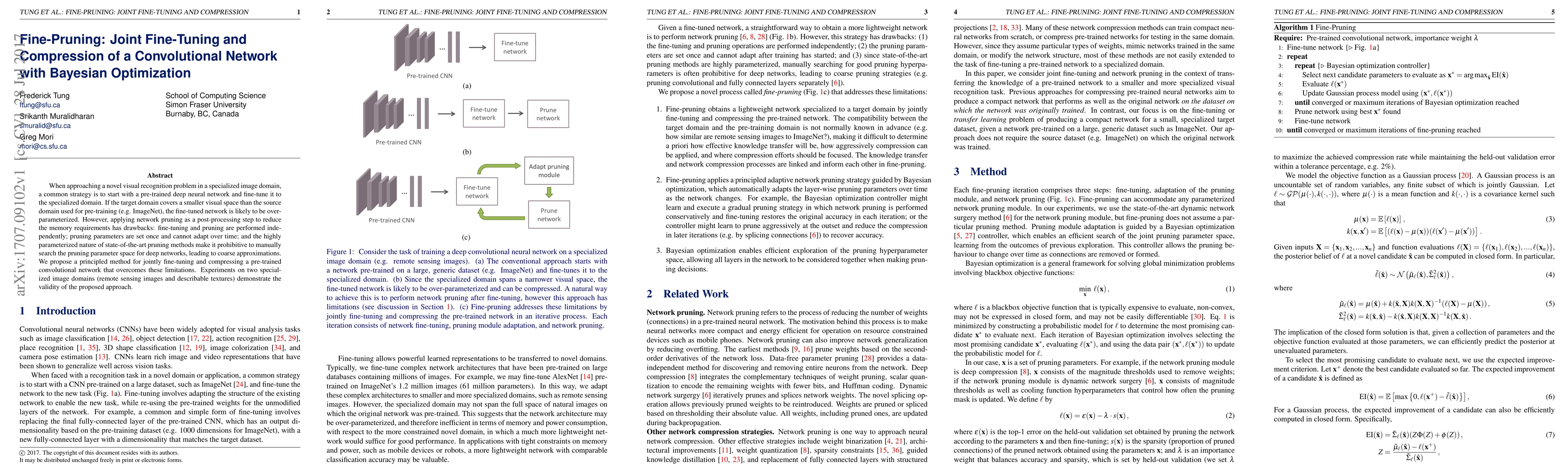 This paper proposes a method called Fine-Pruning that jointly fine-tunes and compresses a convolutional network using Bayesian optimization, addressing the limitations of separate fine-tuning and pruning processes. Experiments show its effectiveness in specialized image domains.