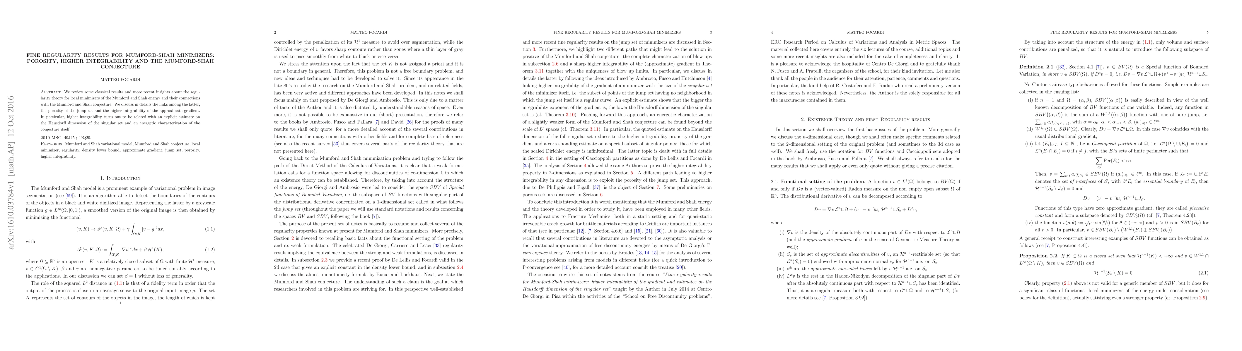 We review some classical results and more recent insights about the regularity theory for local minimizers of the Mumford and Shah energy and their connections with the Mumford and Shah conjecture. We discuss in details the links among the latter, the porosity of the jump set and the higher integrability of the approximate gradient. In particular, higher integrability turns out to be related with an explicit estimate on the Hausdorff dimension of the singular set and an energetic characterization of the conjecture itself.