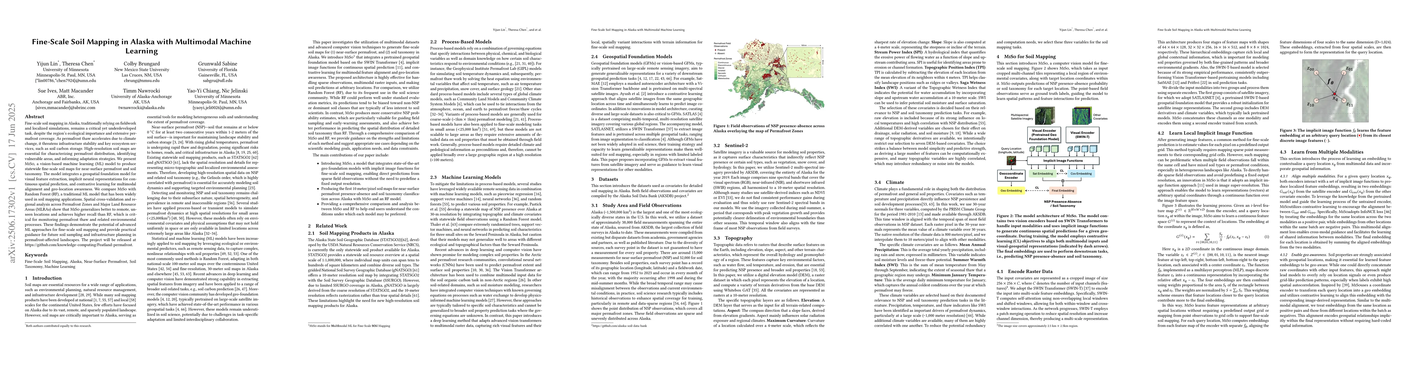 Fine-scale soil mapping in Alaska, traditionally relying on fieldwork and localized simulations, remains a critical yet underdeveloped task, despite the region's ecological importance and extensive permafrost coverage. As permafrost thaw accelerates due to climate change, it threatens infrastructure stability and key ecosystem services, such as soil carbon storage. High-resolution soil maps are essential for characterizing permafrost distribution, identifying vulnerable areas, and informing adaptation strategies. We present MISO, a vision-based machine learning (ML) model to produce statewide fine-scale soil maps for near-surface permafrost and soil taxonomy. The model integrates a geospatial foundation model for visual feature extraction, implicit neural representations for continuous spatial prediction, and contrastive learning for multimodal alignment and geo-location awareness. We compare MISO with Random Forest (RF), a traditional ML model that has been widely used in soil mapping applications. Spatial cross-validation and regional analysis across Permafrost Zones and Major Land Resource Areas (MLRAs) show that MISO generalizes better to remote, unseen locations and achieves higher recall than RF, which is critical for monitoring permafrost thaw and related environmental processes. These findings demonstrate the potential of advanced ML approaches for fine-scale soil mapping and provide practical guidance for future soil sampling and infrastructure planning in permafrost-affected landscapes. The project will be released at https://github.com/knowledge-computing/Peatland-permafrost.