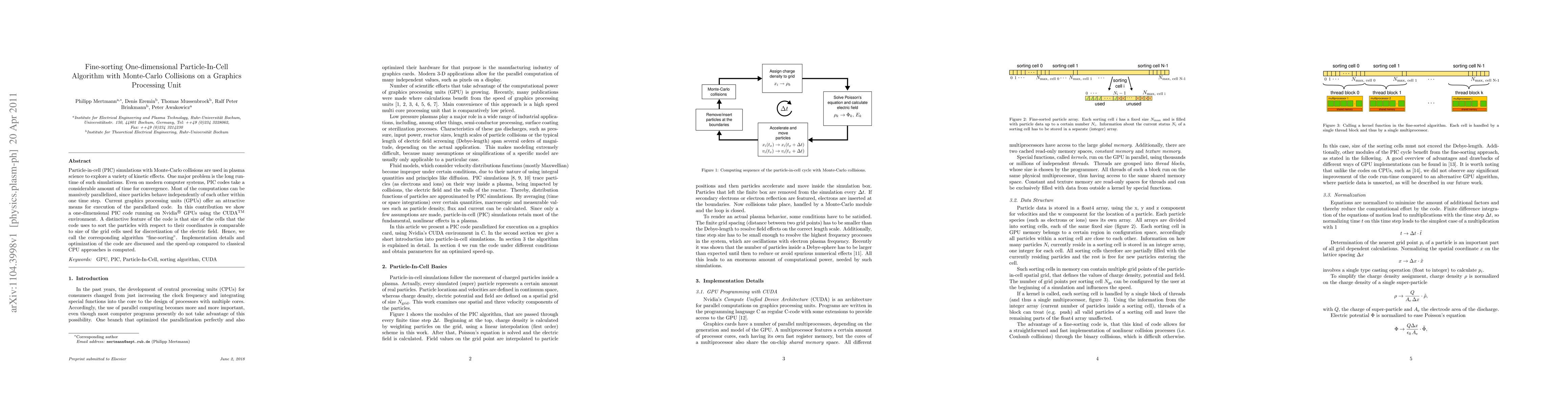 This paper presents a fine-sorting one-dimensional Particle-in-Cell (PIC) algorithm with Monte-Carlo collisions implemented on an Nvidia GPU using CUDA, aiming to reduce the long run-time of PIC simulations. The fine-sorting approach optimizes parallel execution and demonstrates significant speed-up compared to traditional CPU-based methods.
