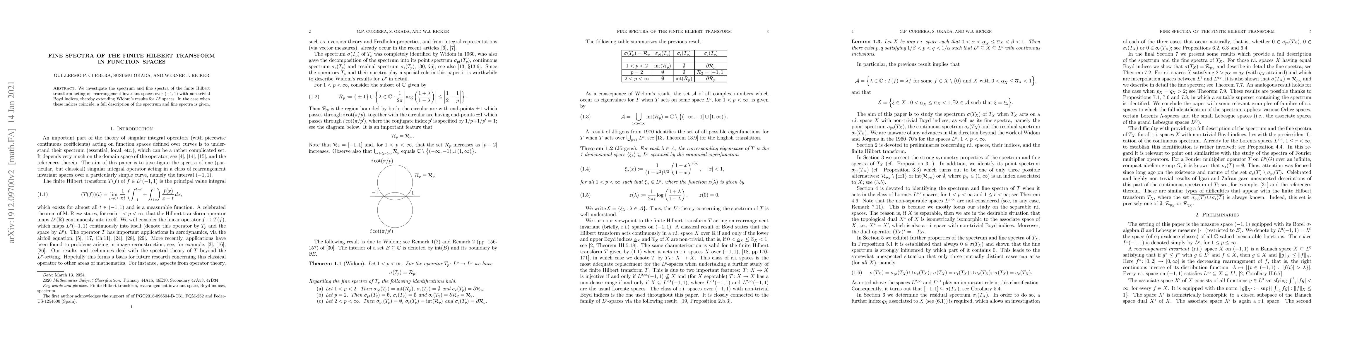 This paper explores the spectrum and fine spectra of the finite Hilbert transform in rearrangement invariant spaces over $(-1,1)$, extending Widom's findings for $L^p$ spaces, and provides a complete description when the Boyd indices coincide.